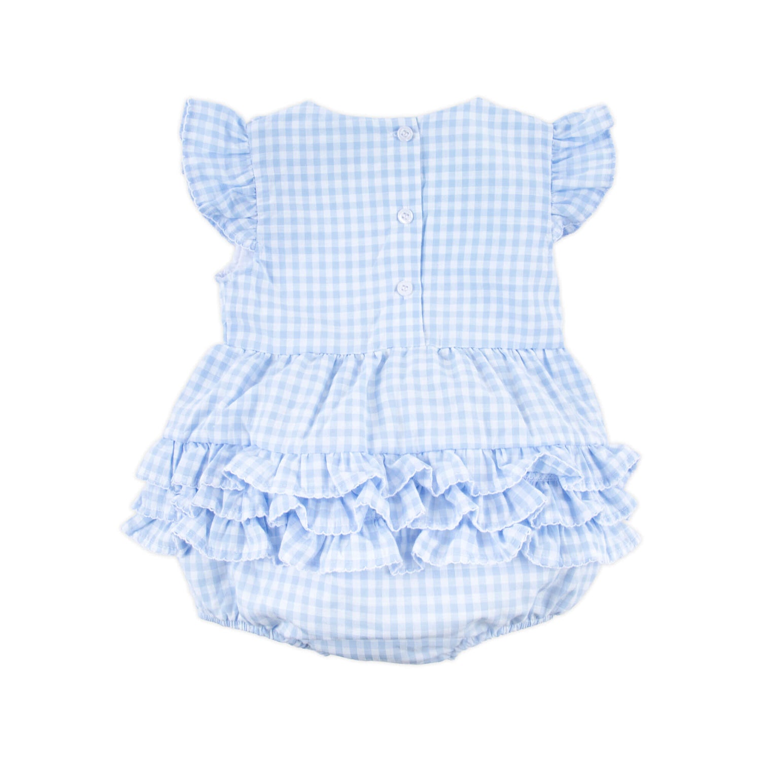 Embrace the charm of sunny days with our Pastel Blue Gingham Ruffle Kate Bubble. The perfect outfit for all your spring and summer adventures. The Kate-style bubble, adorned in delightful blue gingham, features beautiful flutter sleeves that add a touch of elegance and playfulness. It conveniently snaps in stride for easy dressing. For a personalized touch, add a monogram, making this outfit uniquely hers and adding a special charm to her sunny day!