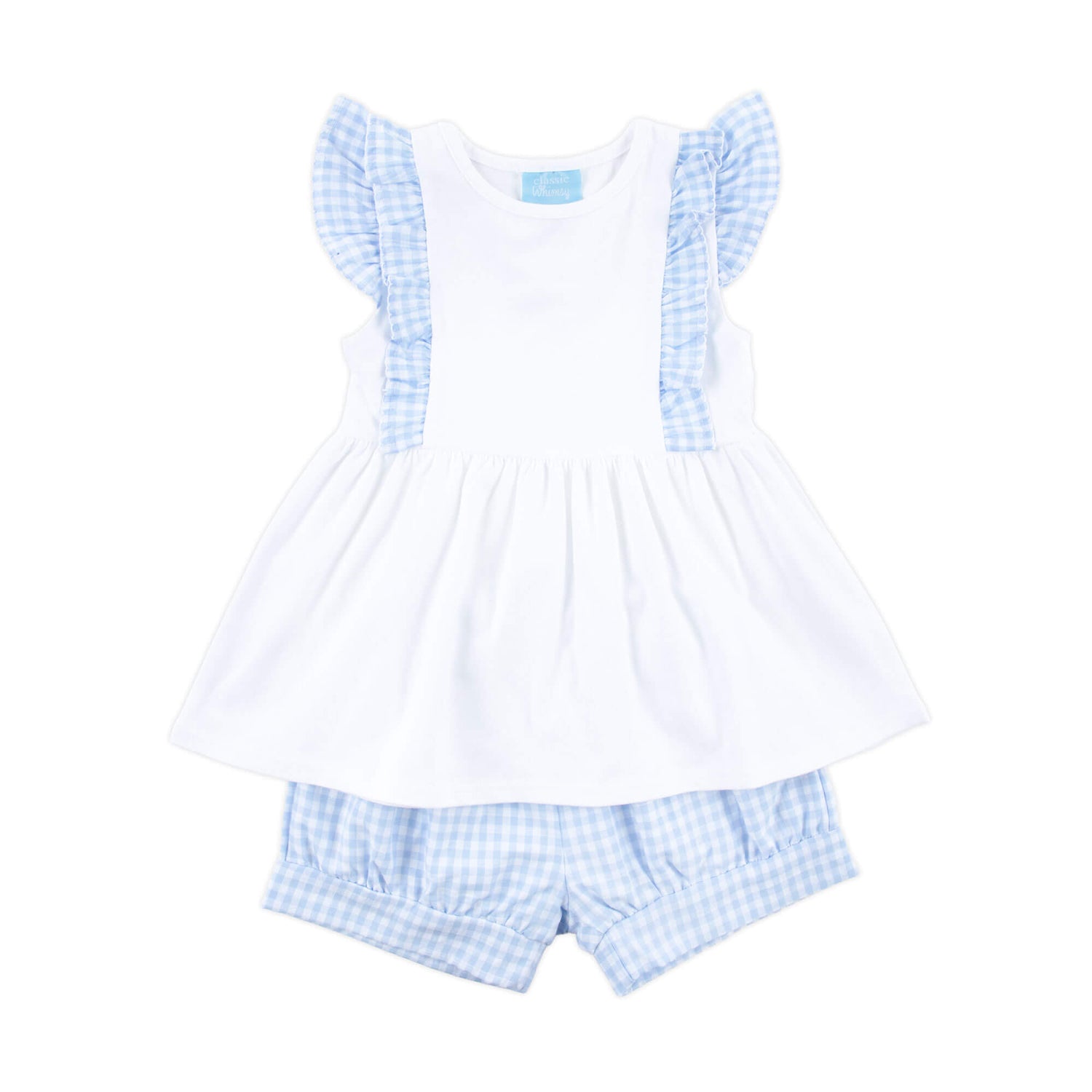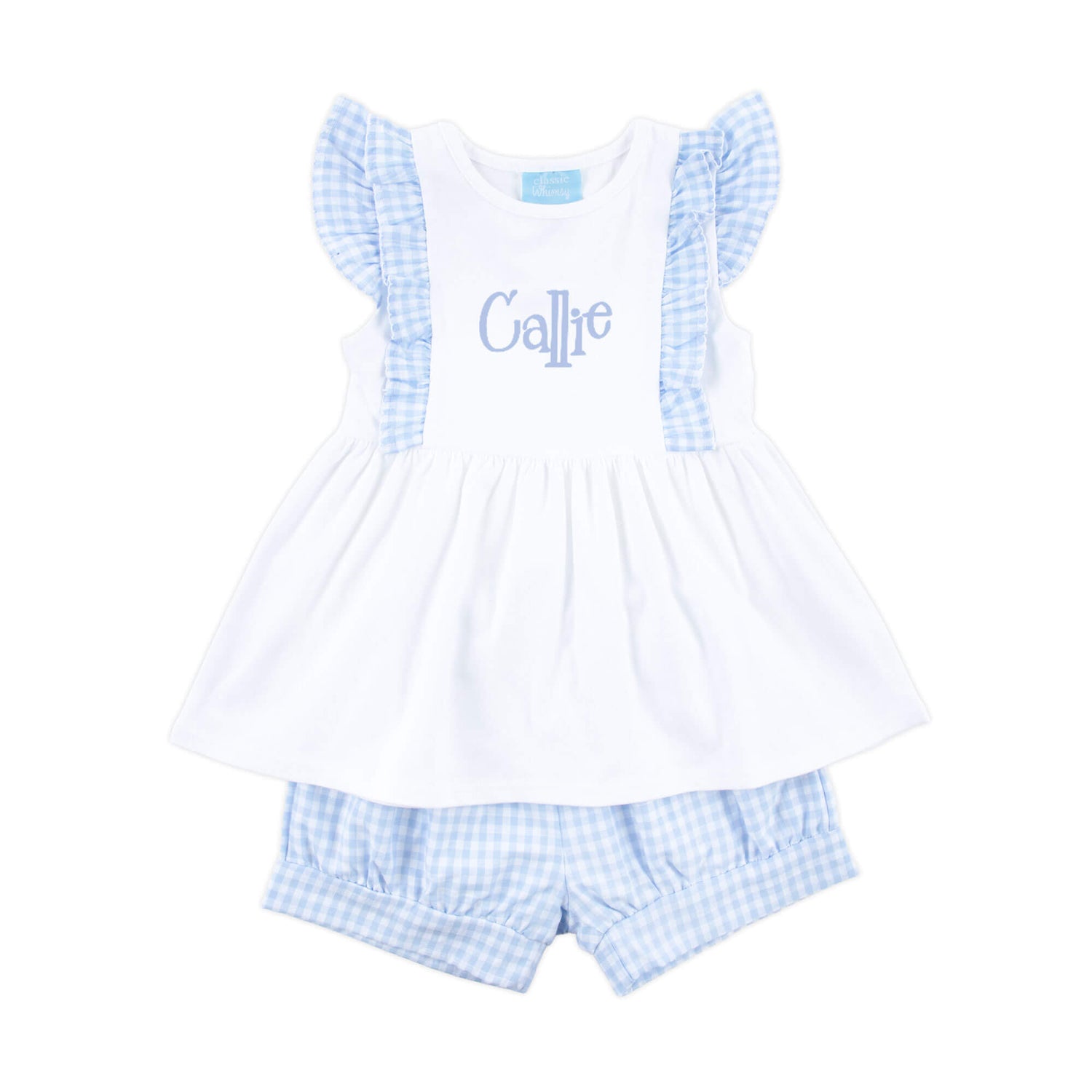 Embrace the charm of sunny days with our Pastel Blue Gingham Ruffle Kate Short Set. The perfect outfit for all your spring and summer adventures. The white Kate-style top features beautiful blue gingham flutter sleeves that add a touch of elegance and playfulness. The set is completed with coordinating blue gingham shorts. For a personalized touch, add a monogram, making this outfit uniquely hers and adding a special charm to her sunny day!