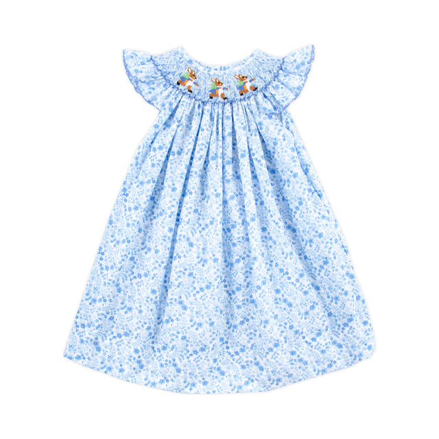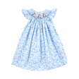 Prepare for Easter in style with our Storybook Rabbit Smocked Dress. This sweet blue floral dress features a smocked design showcasing our favorite book rabbit character. The adorable bishop sleeves with blue picot trim add a charming and sweet touch, making it a delightful outfit for Easter.