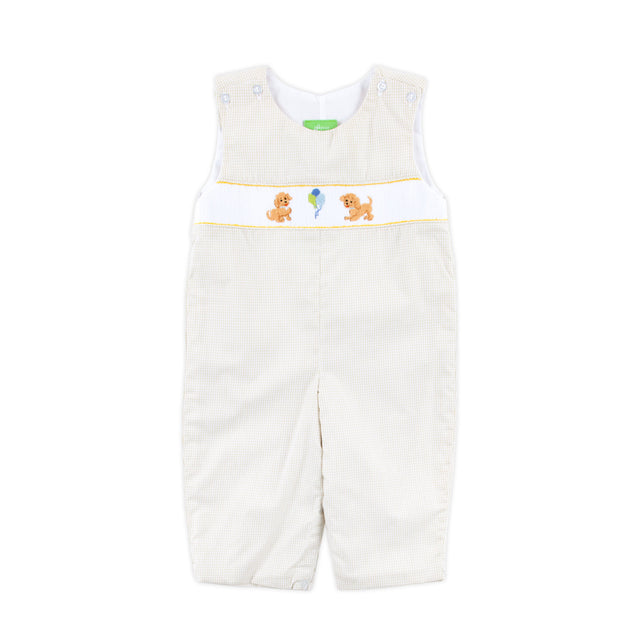 Happy birthday to your little one! Celebrate in style with our Puppy Party Smocked Tan Longall, perfect for the occasion! This tan gingham longall features hand-smocked puppies and birthday balloons. It offers easy dressing with shoulder buttons and convenient snaps.