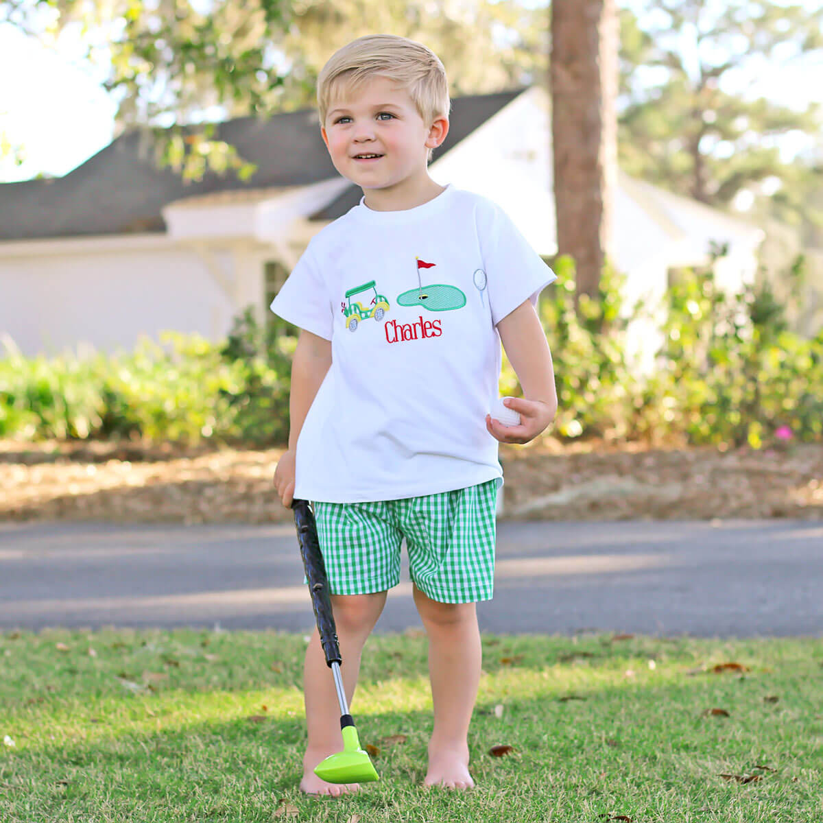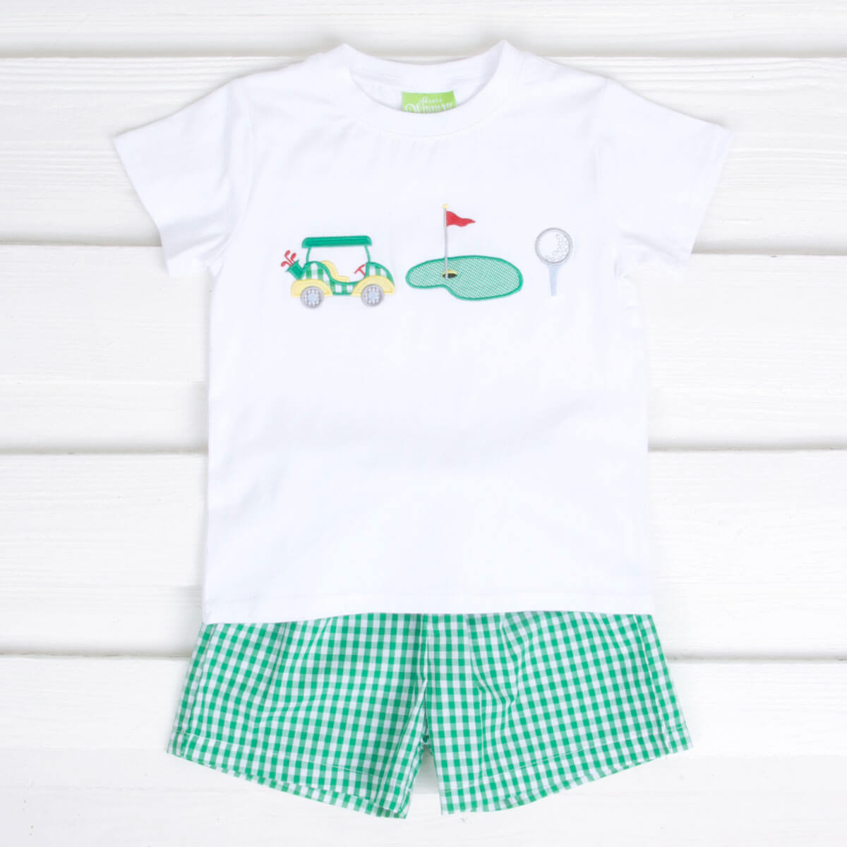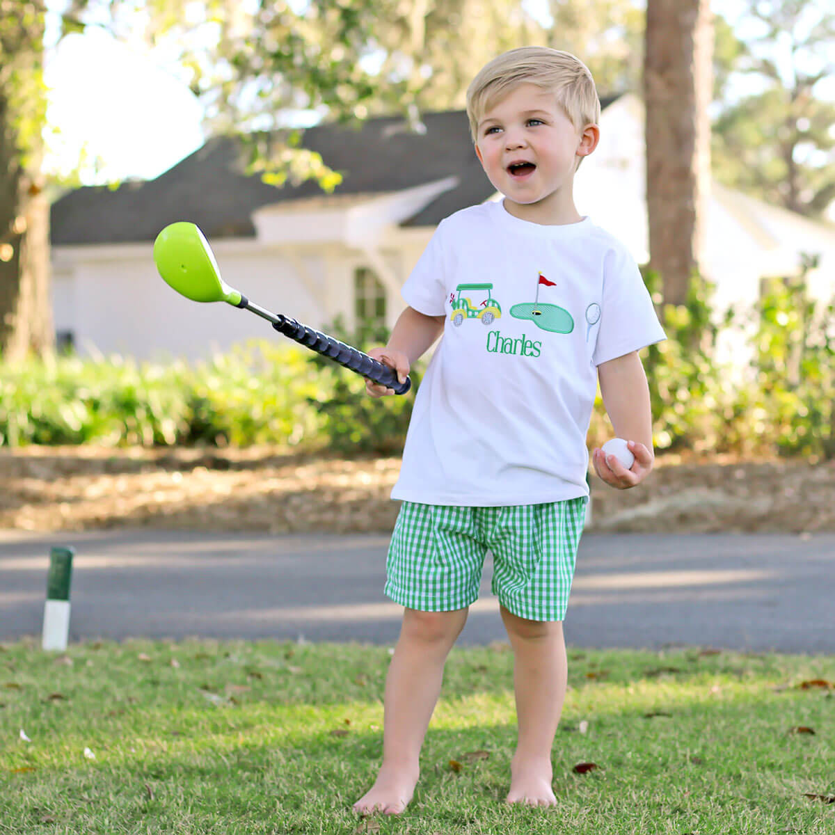 The perfect golf short set for your little guy! Features white knit top paired with green gingham shorts.