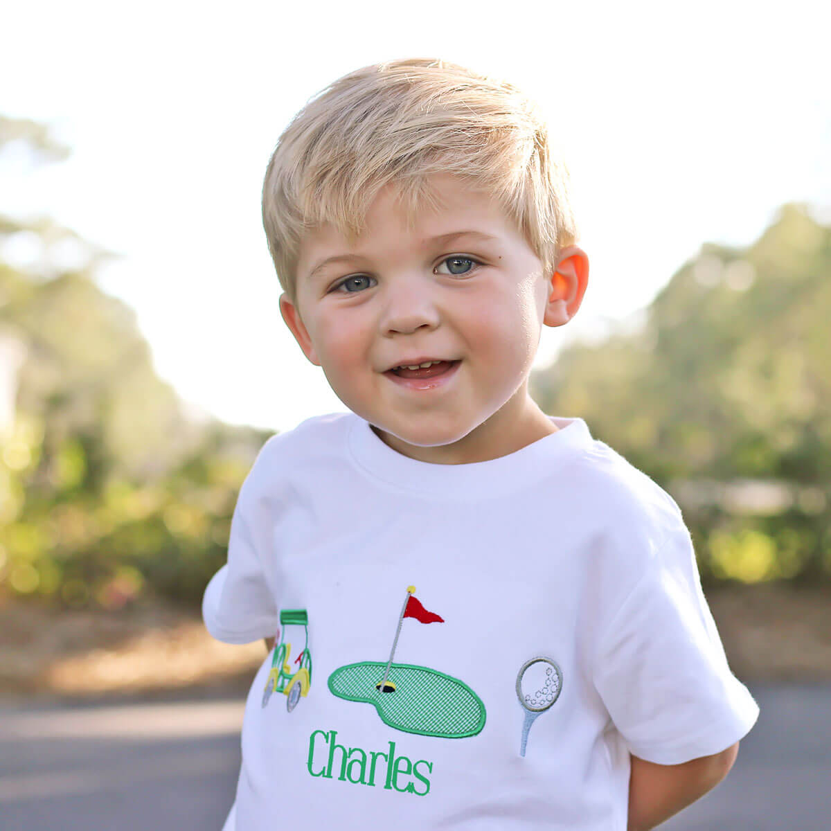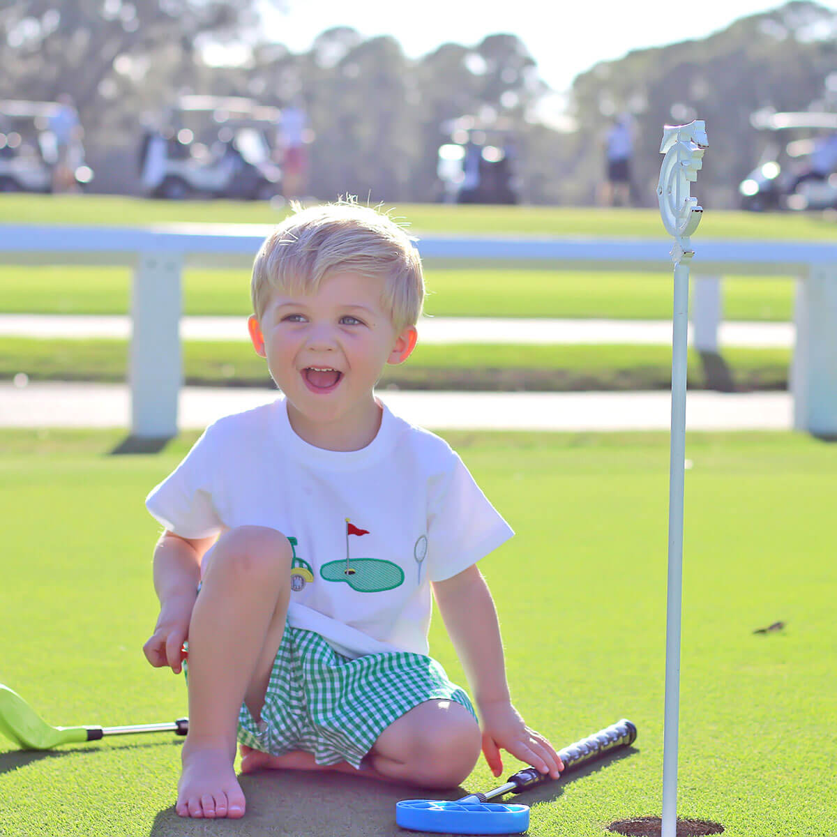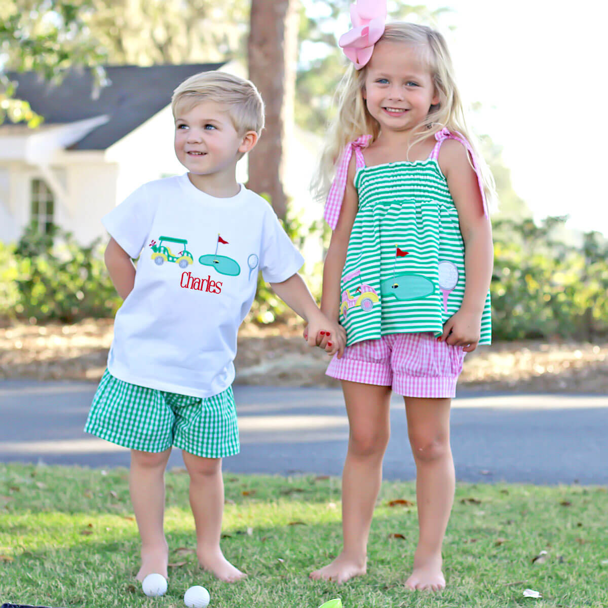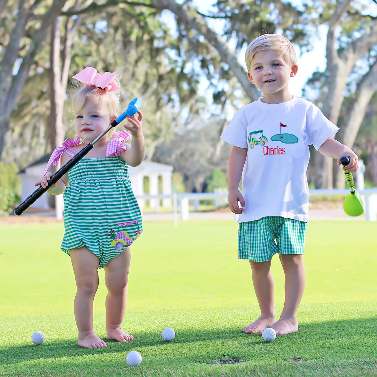 The perfect golf short set for your little guy! Features white knit top paired with green gingham shorts.