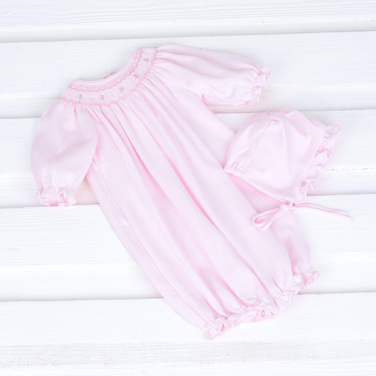 Newborn baby gown features smocked rosebud detailed, long bishop sleeves, elastic at the bottom, and matching bonnet hat. The perfect special gift for a new addition to the family. This piece is "one size" and sized for a newborn.
