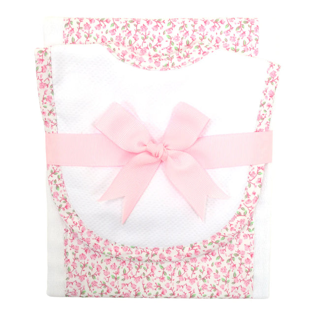 The popular newborn feeding set features a super absorbent burp cloth with a fabric panel sewn down the middle and a small bib backed with 100% cotton terry. This extra thick bib is the perfect size for little droolers and early feedings. This set comes tied with a gorgeous grosgrain bow; ready for gifting!
