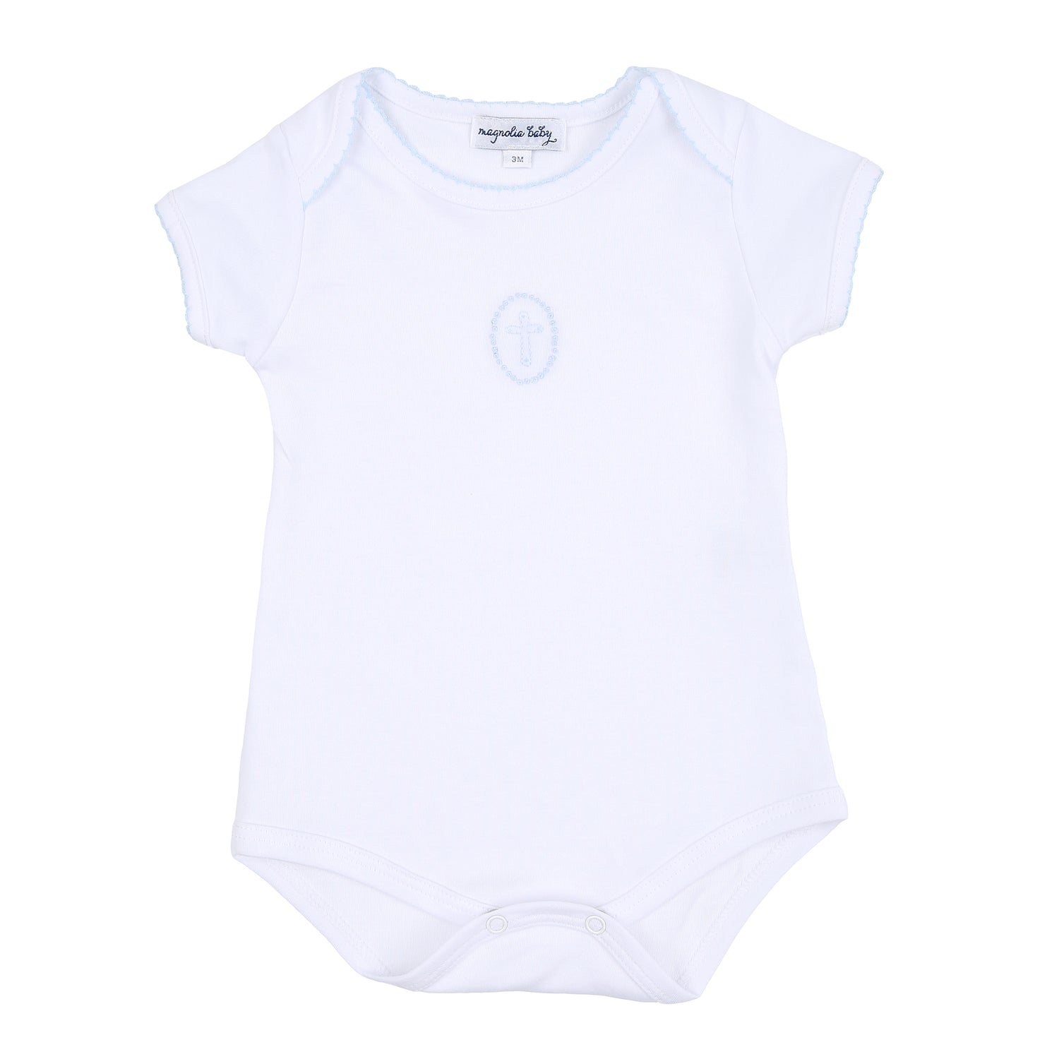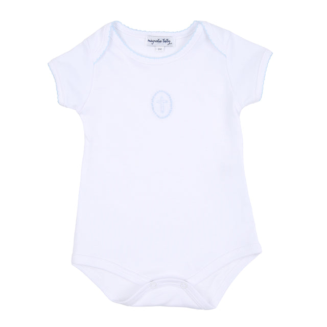 For your little blessing! Made from the softest white pima cotton with light blue trim and delicate cross embroidery. Coordinates with other items in the Blessed Collection by Magnolia Baby.