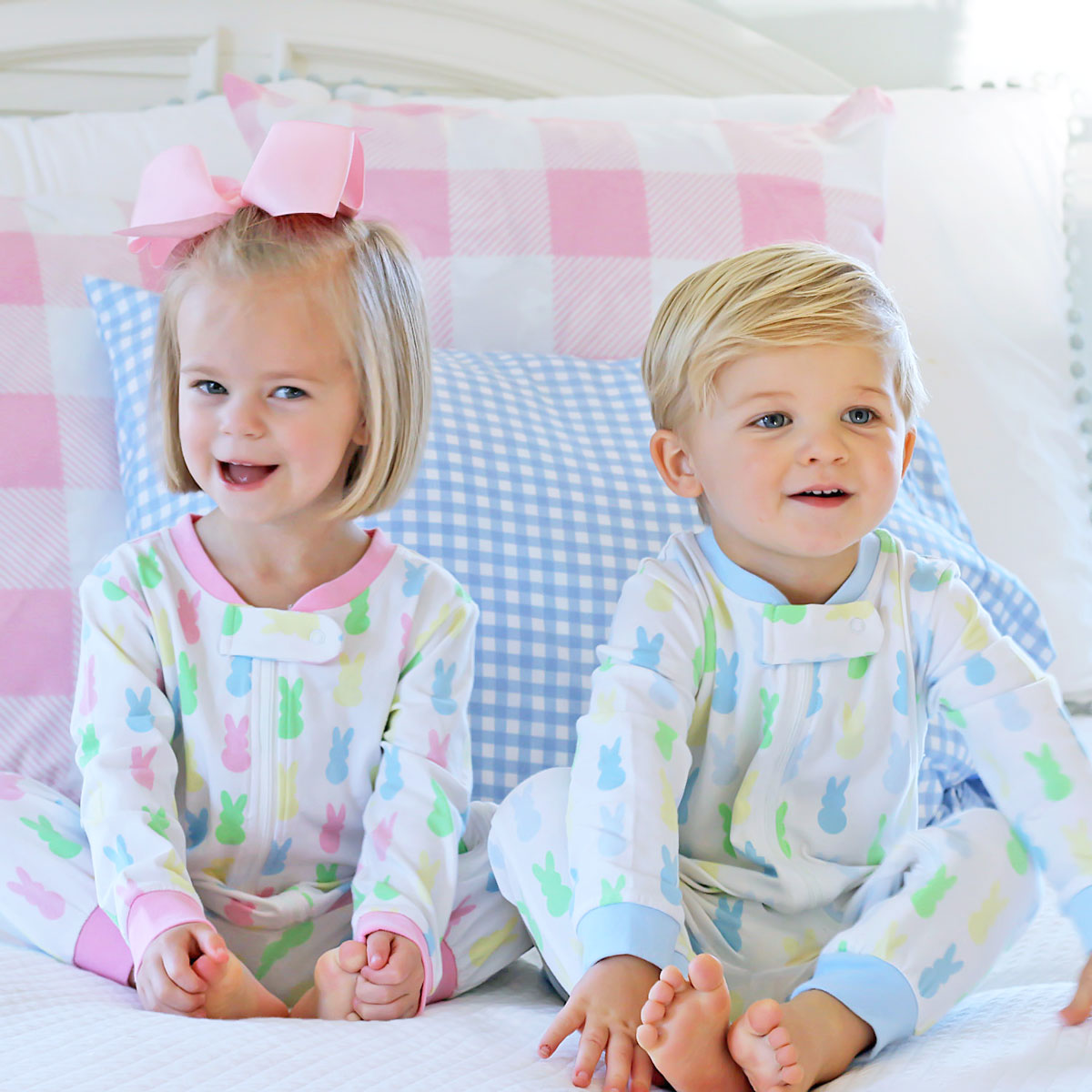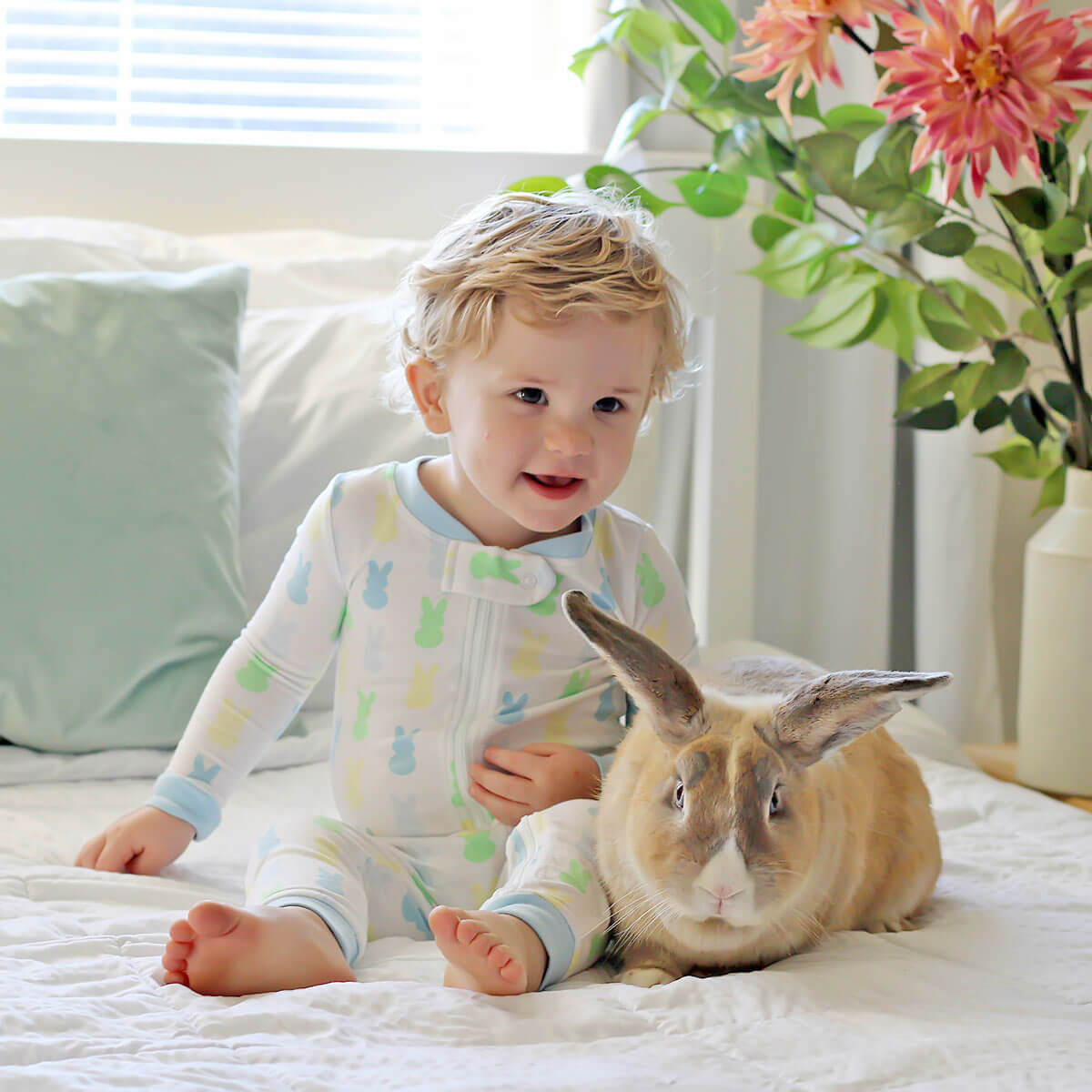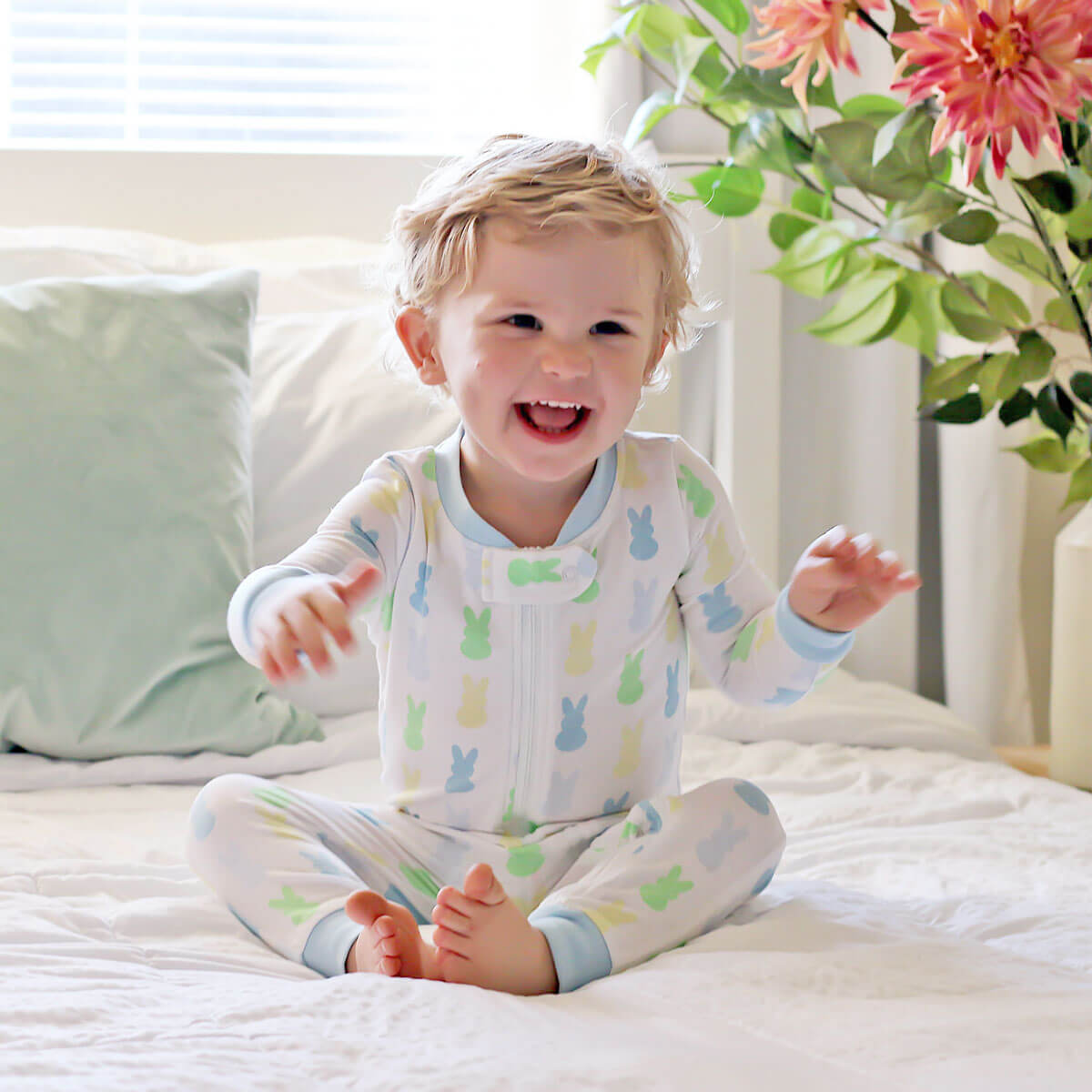 Prepare for Easter festivities with our delightful Colorful Peeps Blue Zip Sleeper! Designed for comfort, this adorable onesie sleeper features a playful peep print paired with charming light blue ribbing. The convenient zip-up front zipper ensures easy dressing, while the sewn-down back flap adds a touch of practicality. Choose from selected sizes available in both footed and footless styles. This sweet sleeper not only keeps your little one cozy but also makes for a perfect Easter gift, bringing joy and warmth to their dreams.