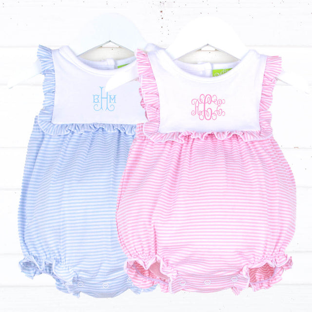 This Stripe Knit Bib Bubble is an irresistible choice for any season. Soft and sweet pink and blue stripes with ruffle bib detailing for an extra touch of charm. With convenient snaps for easy dressing, this girl's bubble is both stylish and practical. You can make it even more special by adding a monogram to create a personalized look.