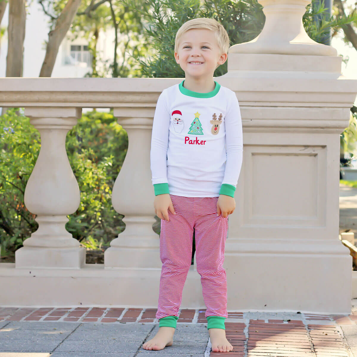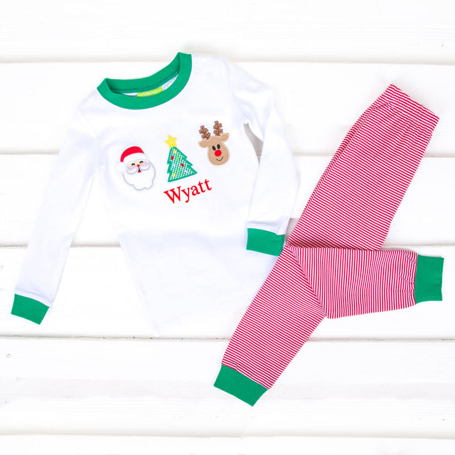 These Christmas Cheer Pajamas will have your little one ready for Christmas morning! The white long sleeve pajama top features our classic Christmas appliqués, including Santa, a Christmas tree, and a reindeer. The set includes red stripe pajama bottoms with green ribbing. Add a monogram to personalize your Christmas look.
