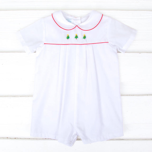 Celebrate his first holiday season with our Christmas Tree Embroidery White Shortall! This charming white outfit features mini embroidered Christmas trees for a festive touch. Snaps in stride for easy changes.