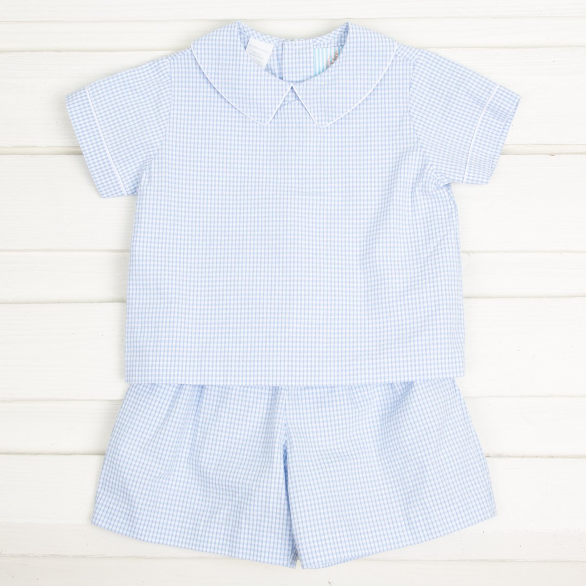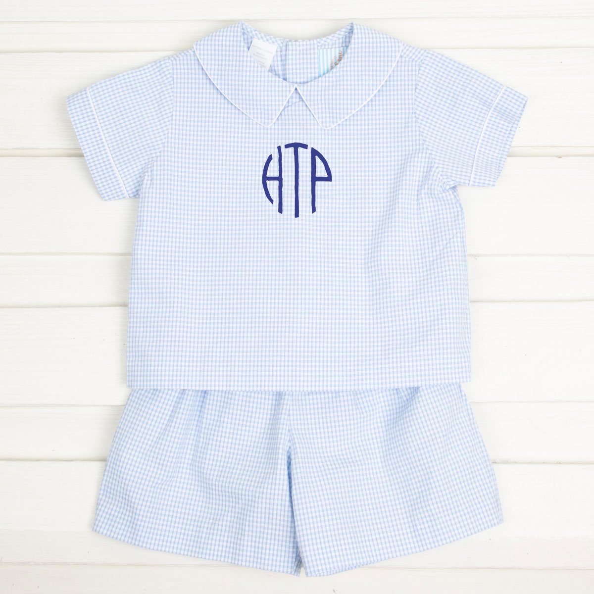 A Spring classic! You can add a monogram to this light blue seersucker set to create the perfect staple piece.