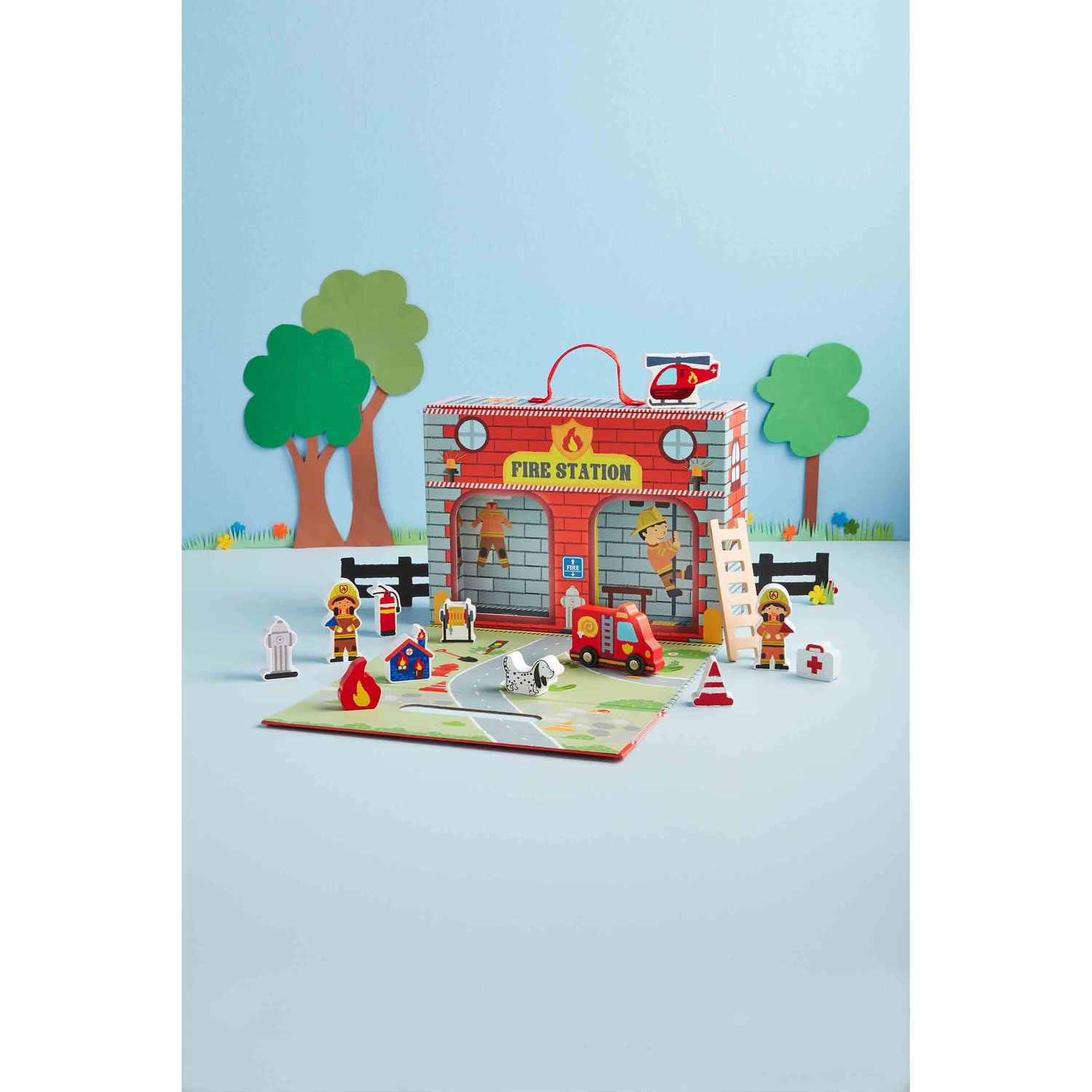 Playtime just got even better with our Fire Station Play Box Set. The fourteen piece set comes with cardboard fire station box. The fire station box holds thirteen wooden pieces and unfolds easily for playtime, and folds back for storage. This toy set is intended for children ages 3 and older.