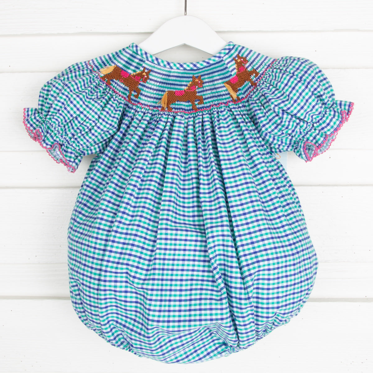 Horse Smocked Bubble Green & Blue Plaid