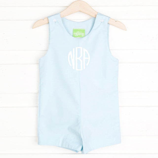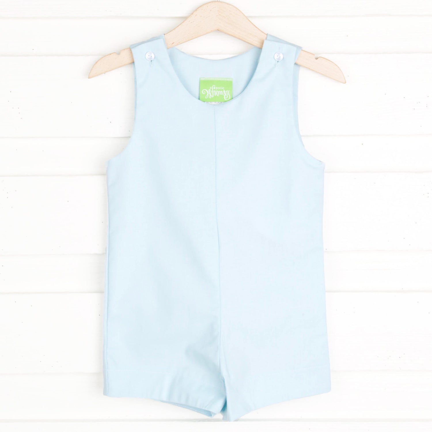 A delightful Spring/ Summer classic! A fun light aqua shade perfect for a day out at the park or the lake. Cute button strap details for a timeless and classic look. Embroider this light aqua jon jon for a more personalized look!