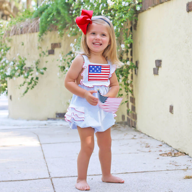 This Flag Applique Light Blue Stripe Leah Bubble is ideal for your 4th of July celebration. It features cross-back straps, an American flag appliqué, white back ruffles with red trim, and convenient snaps in the stride.