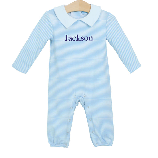 How sweet is the Miller Light Blue Stripe Knit Romper? It’s perfect for any occasion! This light blue striped romper features long sleeves and snaps in the stride for easy changes. Whether it's playtime or a special event, this outfit is both adorable and practical. Add a monogram to make it uniquely his.