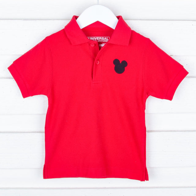 Stay comfy and cute on your magical vacation! This short sleeve boy's pique polo shirt features an embroidered mouse ears icon.
