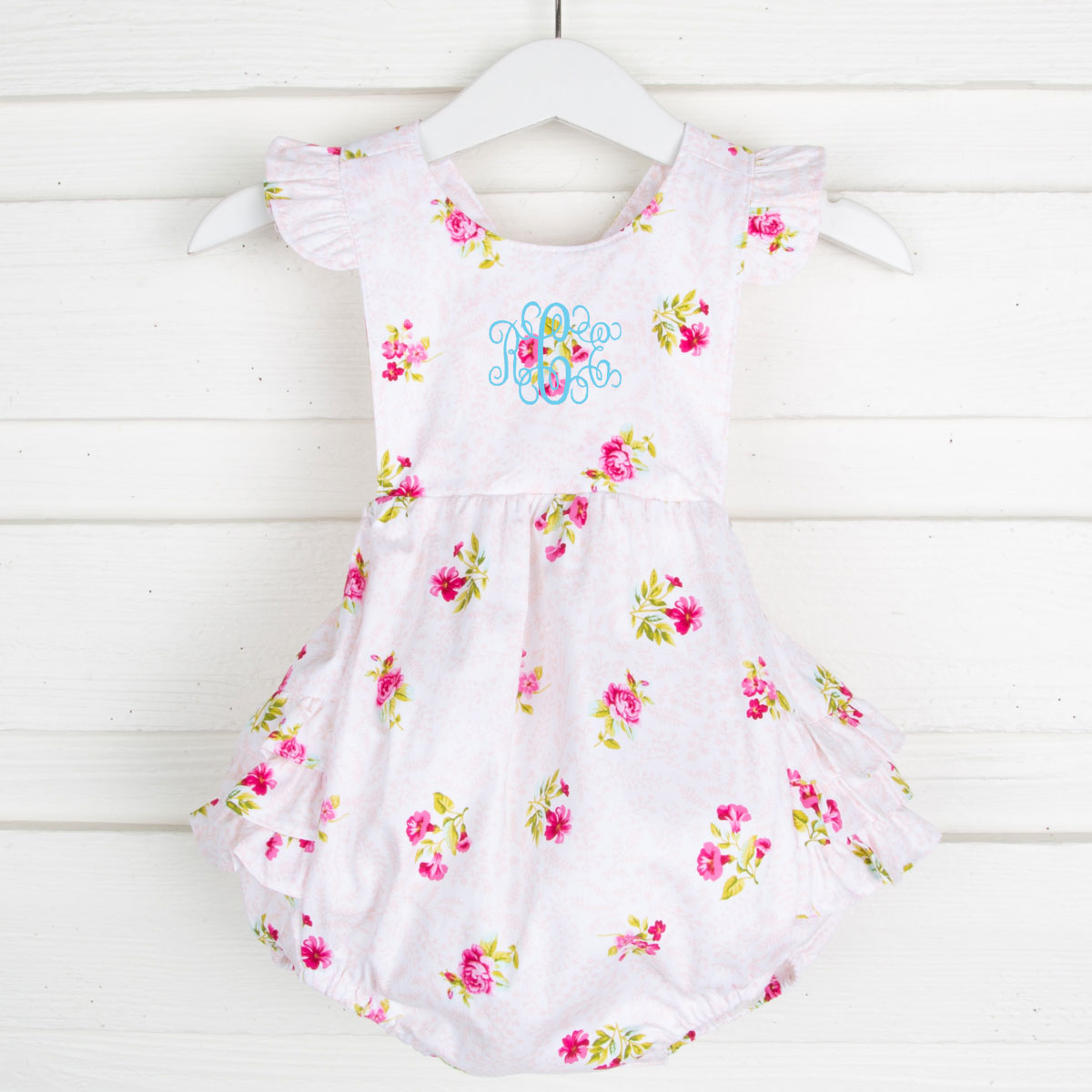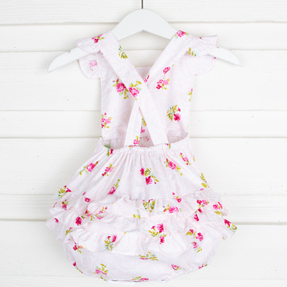 Bloom into the warmer weather with this adorable pink floral ruffle bubble! Features snaps in the stride.