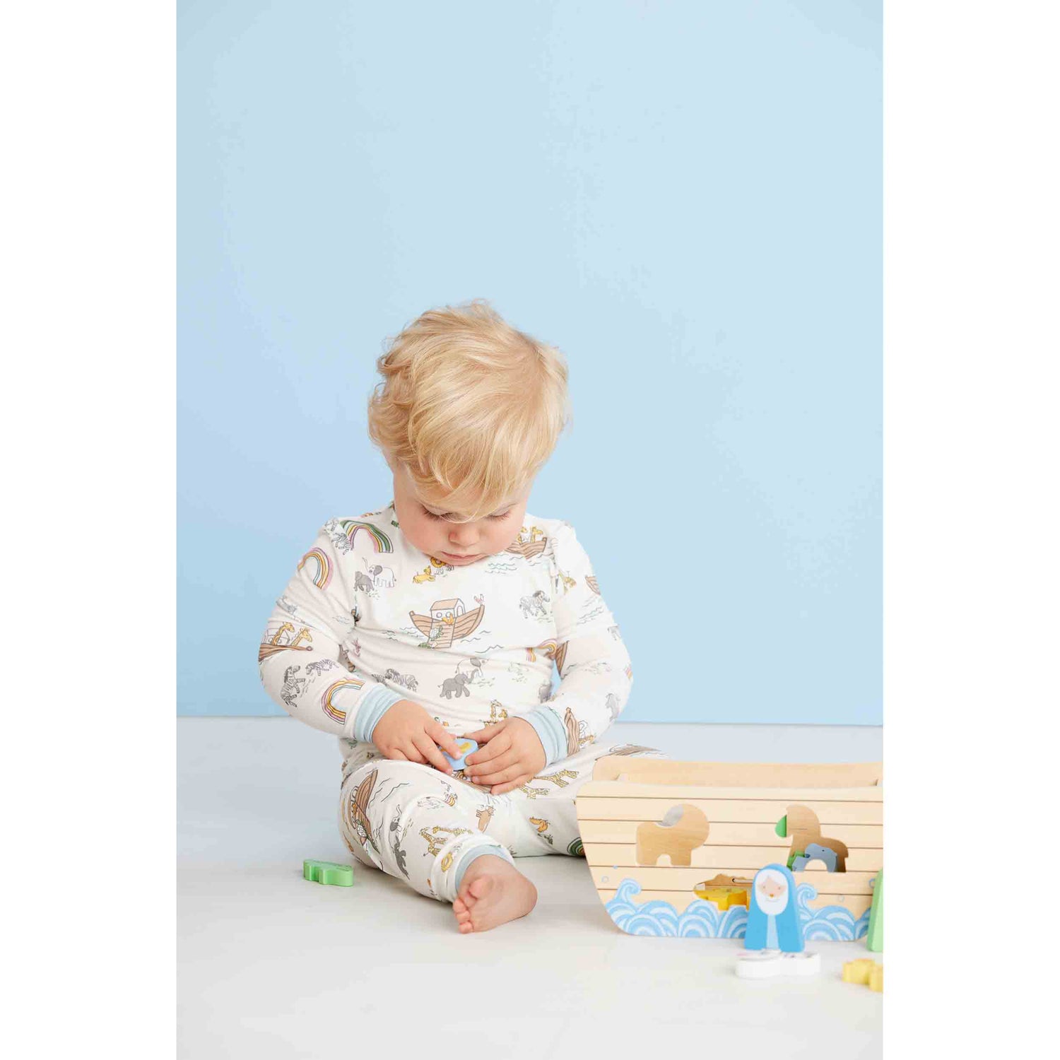 Your little snuggle bug needs these Blue Noah's Ark Toddler Pajama Set. The two piece set comes with knit bamboo long pajamas. The pajamas feature a white background with a Noah's Ark themed pattern throughout. The pajamas feature a blue neckline, wrist and ankle hem.