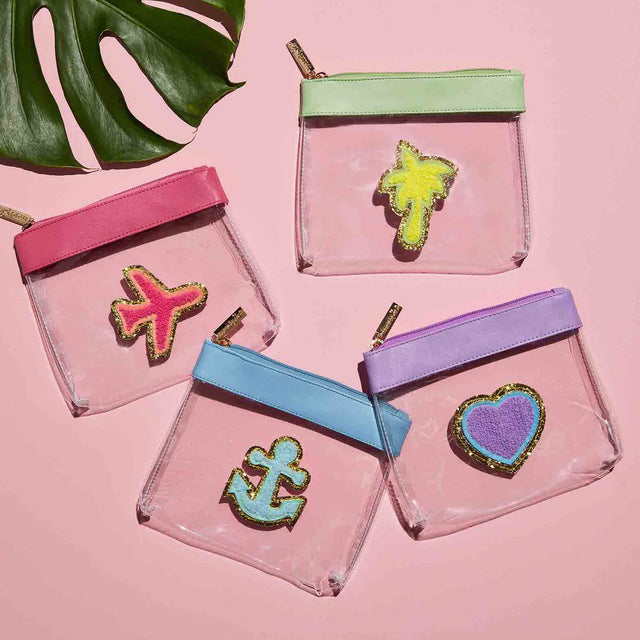 Our Patch Icon Clear Case is a must-have for summer travel. The clear vinyl zipper case features a bright icon patch. The zipper case also features a faux leather trim. We love to use these for bachelorette party gifts! Fill with your favorite beach essentials.