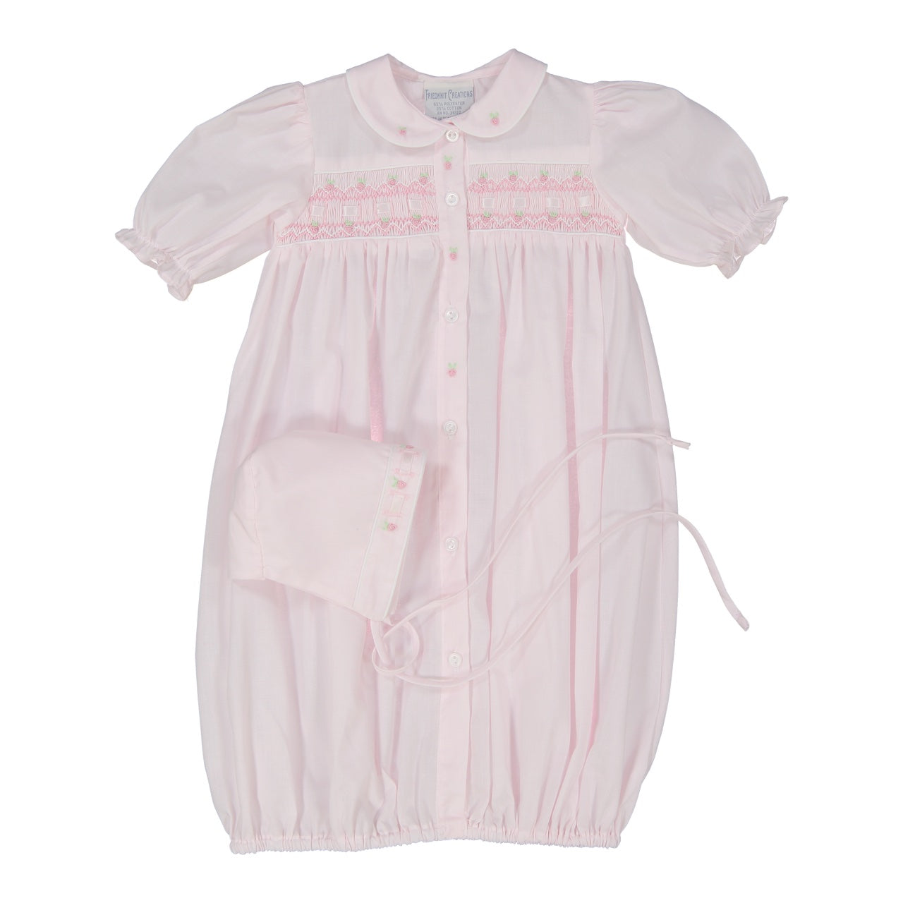 Pretty in pink - your little one will look just precious in this Rosebud Light Pink Smocked Gown with Hat! In a pastel pink color with piping along the rounded collar, this piece is as sweet as your baby girl. The smocking on top features a beautiful hand embroidered chevron design along with tiny flower buds and this piece's signature detail - delicate basket woven ribbon going throughout the smocking. Soft gathered pleats descend from the bodice on either side of the button placket, which is accented with delicate embroidered flower buds to match the bodice. This set includes a matching pink hat with flower embroidery and basket woven ribbon. Whether for your own baby or a loved one, this beautiful and classy take me home set is sure to make every little princess shine!