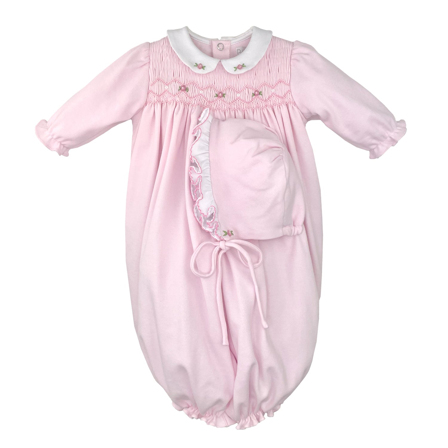 Rosebud Smocked Pink Convertible Gown and Bonnet Set