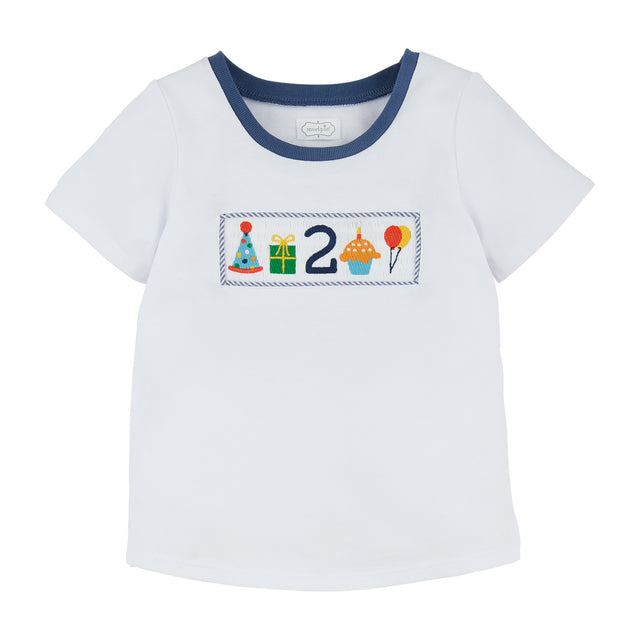Make your little one's 2nd birthday extra special with our charming Smocked Tee. Crafted from ultra-soft cotton, this short sleeve jersey tee showcases a delightful smocked embroidery on the chest, adding a touch of elegance to the birthday celebration. It's the ideal outfit for your baby boy to shine on his momentous day. To maintain its pristine condition, simply turn it inside out before washing it with similar colors in the washing machine. Avoid using bleach and opt for low tumble dry to keep it looking its best. If it needs a little touch-up, a cool iron will do the trick, but be sure to avoid ironing the adorable applique.