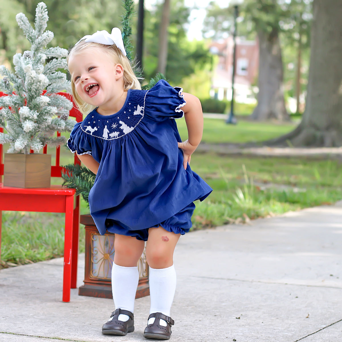 It's the most joyous time of the year and our Smocked Nativity Royal Blue Corduroy Bloomer Set is perfect for Christmas. Features hand-smocked Nativity.