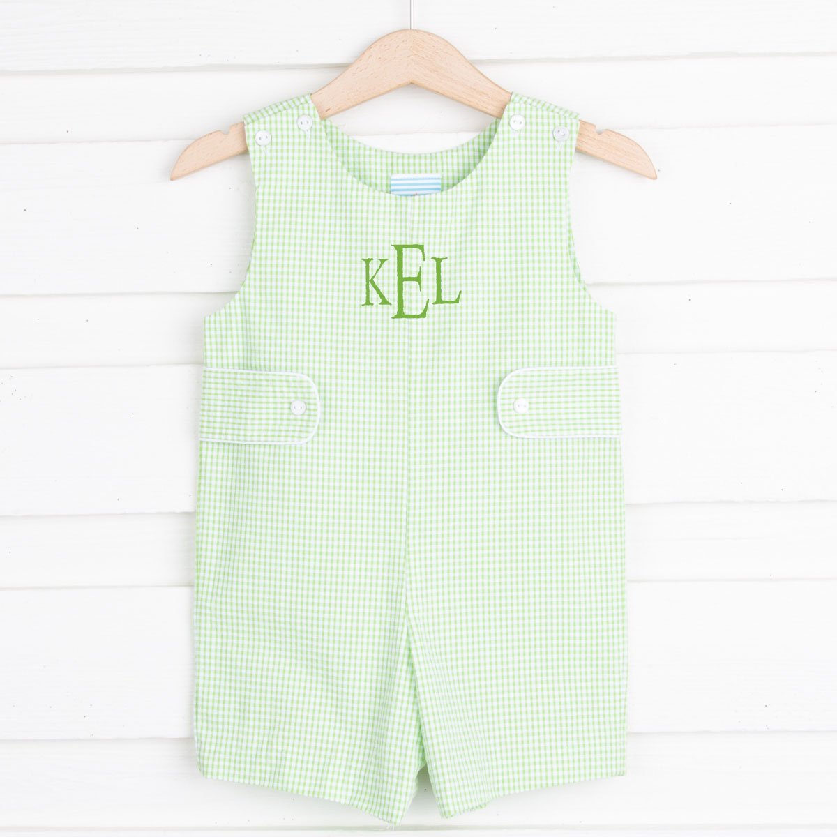 We love adding monograms to cute Jon Jons like this one! The light green seersucker is perfect for Spring. Snaps in stride.