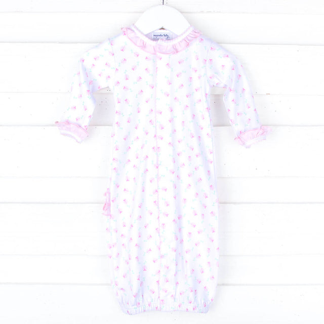 Indulge in the adorable charm of Tessa's Classic Floral Pink Ruffle Converter Gown. This gown features a delightful pink floral print on the softest pima cotton fabric, ensuring your little one snuggles in comfort.