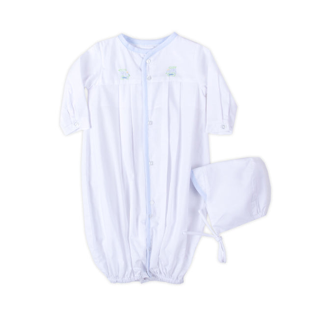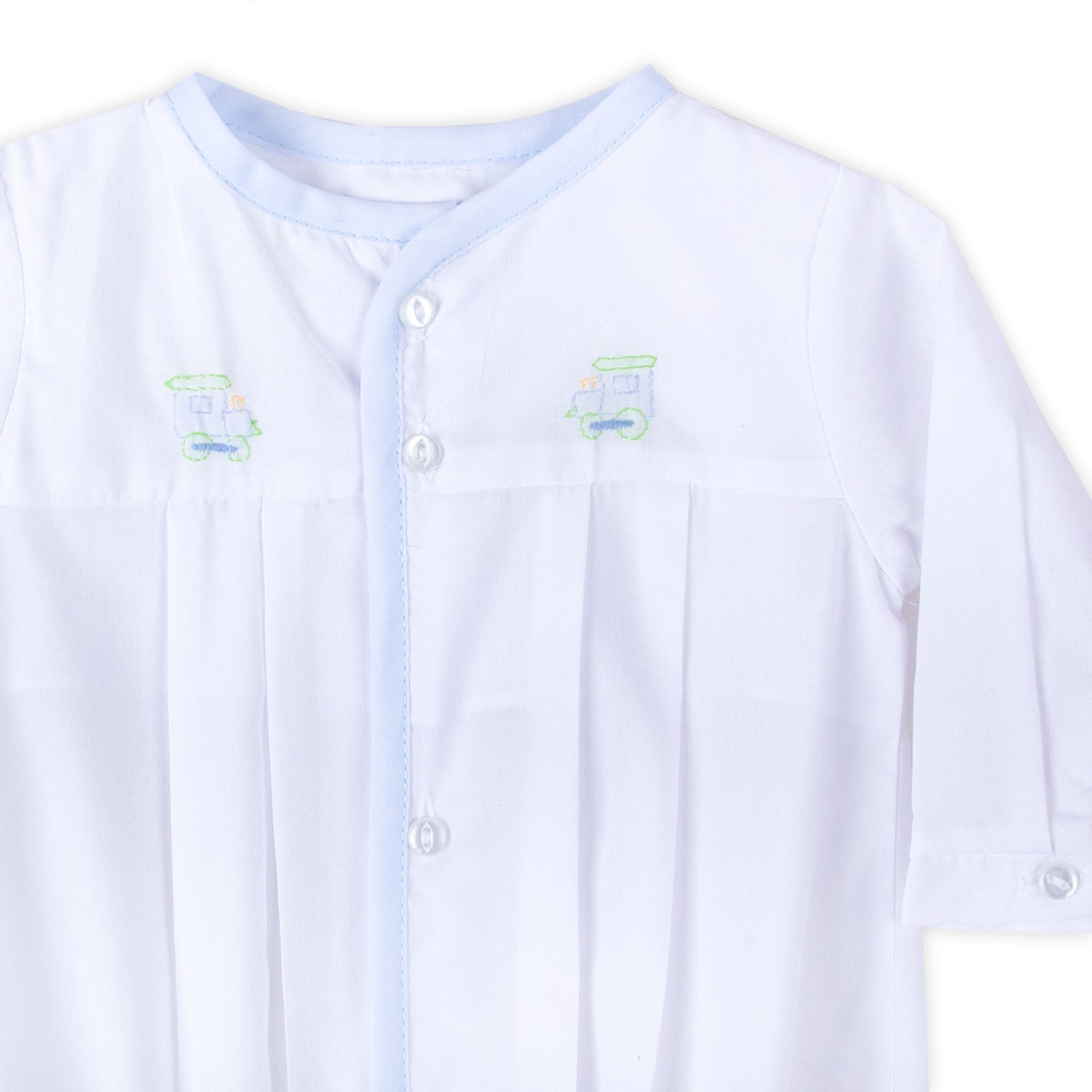 This Train Embroidered White Long Sleeve Converter is a charming choice for any special occasion. It features beautifully embroidered trains, pleated details, and convenient snaps that allow it to convert into a longall for versatile wear. Complete with a matching bonnet, it's perfect for special events like church, christenings, or holidays.