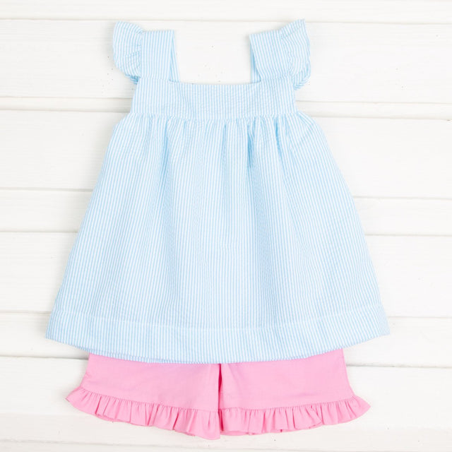 This adorable Amy short set is perfect for Spring and Summer. A turquoise seersucker top with ruffle straps and pink ruffle shorts. Your little one will be the cutest at the playground!
