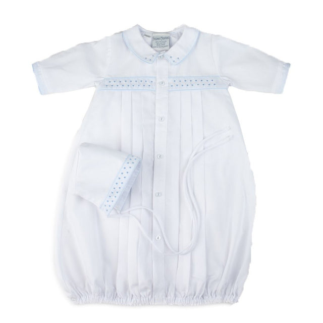 Sweet, sharp, and oh so classy. This Dot Embroidered Collared Gown with Hat is the perfect "take me home set" for baby boys. It sure to become a treasured family favorite, with its beautiful detailing and excellent heirloom quality. Dainty dot embroidery decorates the collar, bodice, and matching hat. Three stiff pleats go down the length of the piece on either side of the button placket.