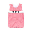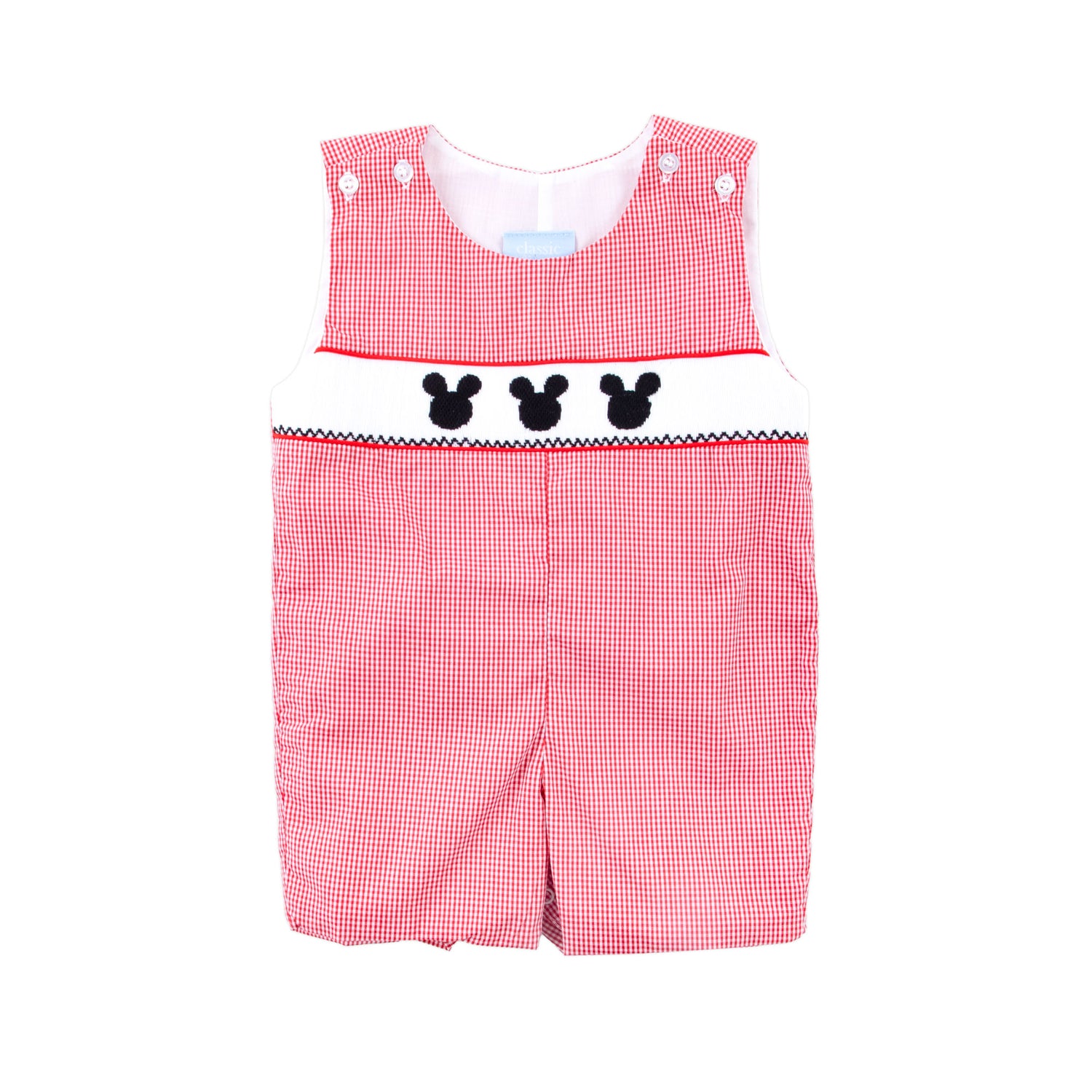 This adorable and classic mouse ears outfit is a must for your next fairytale vacation! Features hand-smocked mouse ears on a red gingham fabric. Shoulder buttons and snaps in stride.