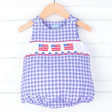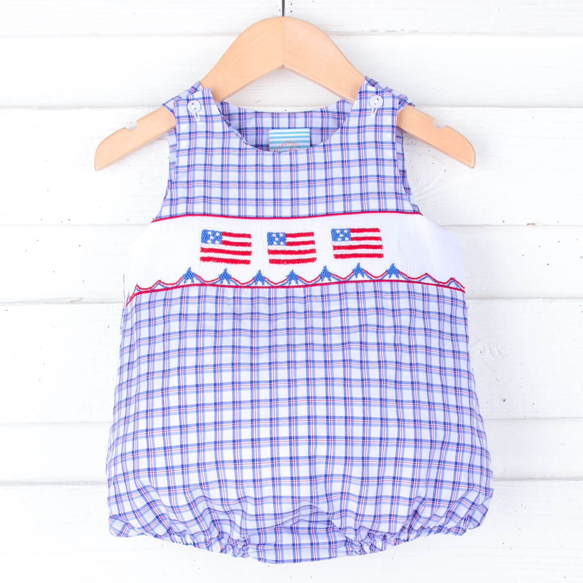 This American Flag Smocked Blue Plaid Sun Bubble is a patriotic favorite! Featuring smocked American flags across the chest and a charming blue plaid fabric, it’s perfect for 4th of July parades, fireworks, and festive celebrations. Shoulder buttons and convenient snaps in the stride make dressing a breeze.