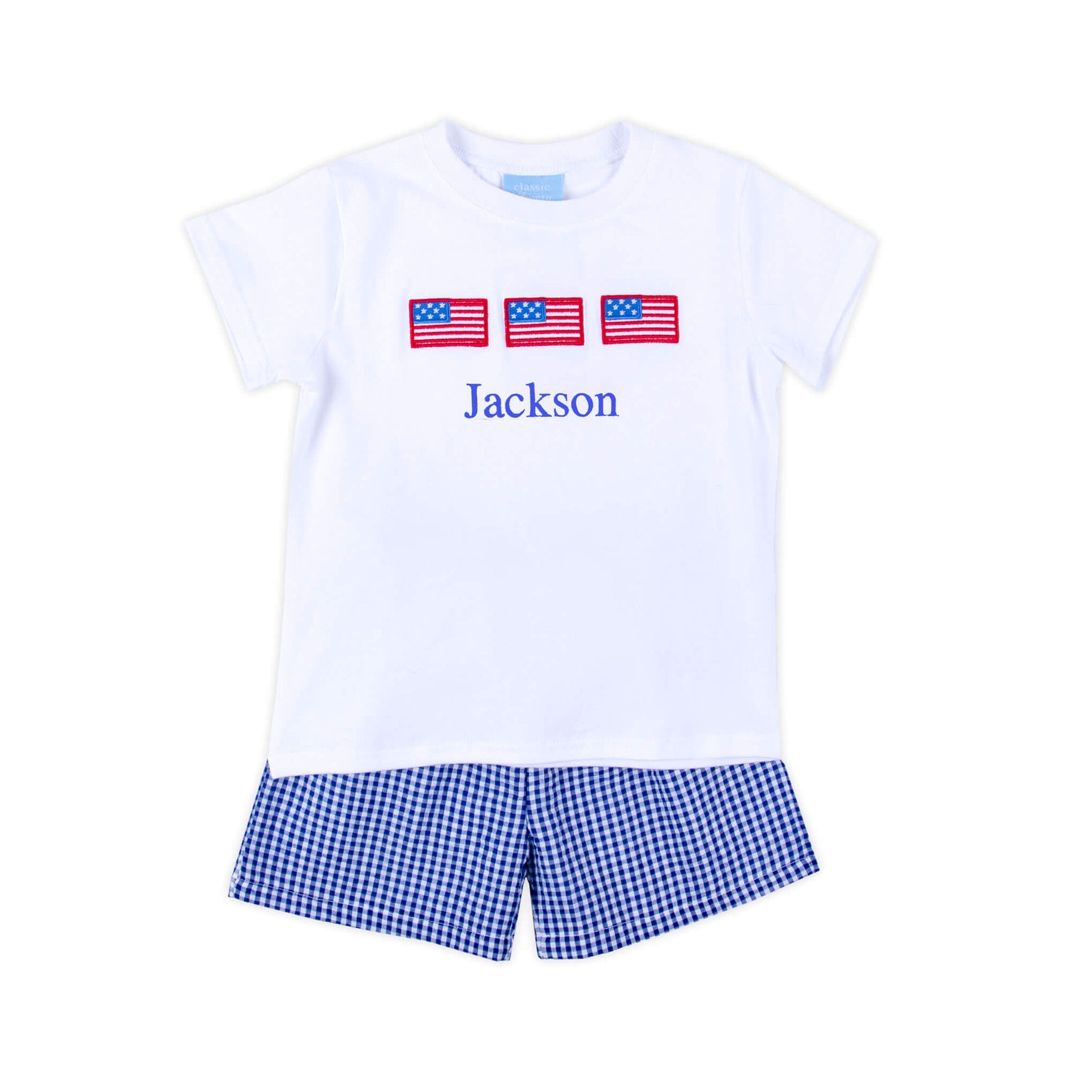Celebrate the 4th of July in this American Spirit Blue Gingham Short Set. The white knit shirt features three flags applique, perfectly complemented by the blue gingham shorts. This outfit is the perfect patriotic outfit for your little one's summer plans! Add a monogram to make it uniquely theirs!