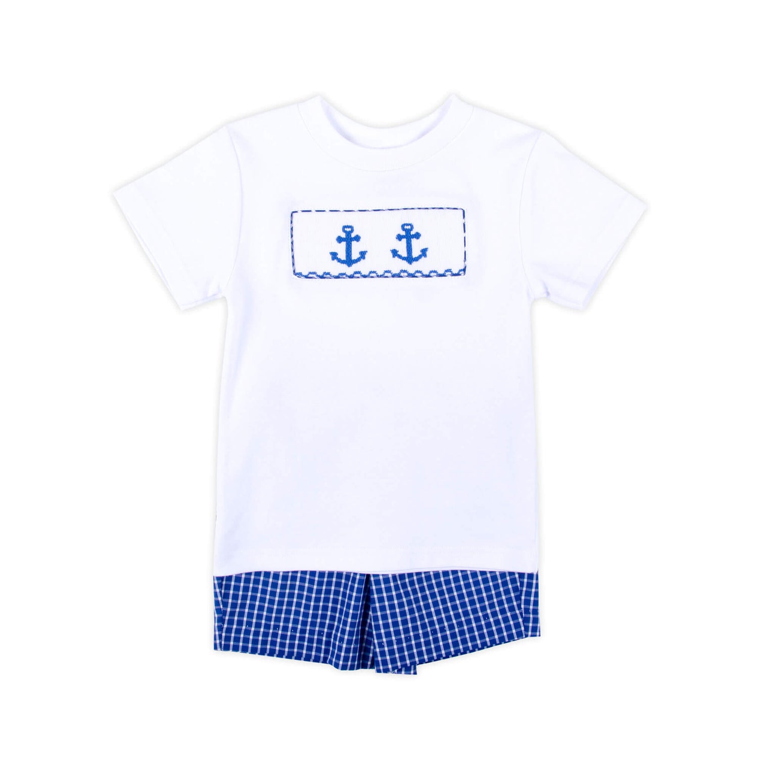 Elevate your little one's nautical style with the Anchor Smocked Blue Windowpane Short Set, the perfect outfit for a touch of charm. The white knit shirt in this outfit features smocked navy anchors. Complete with navy and white check shorts. Perfect for beach vacations, family getaways, or any summer adventure!