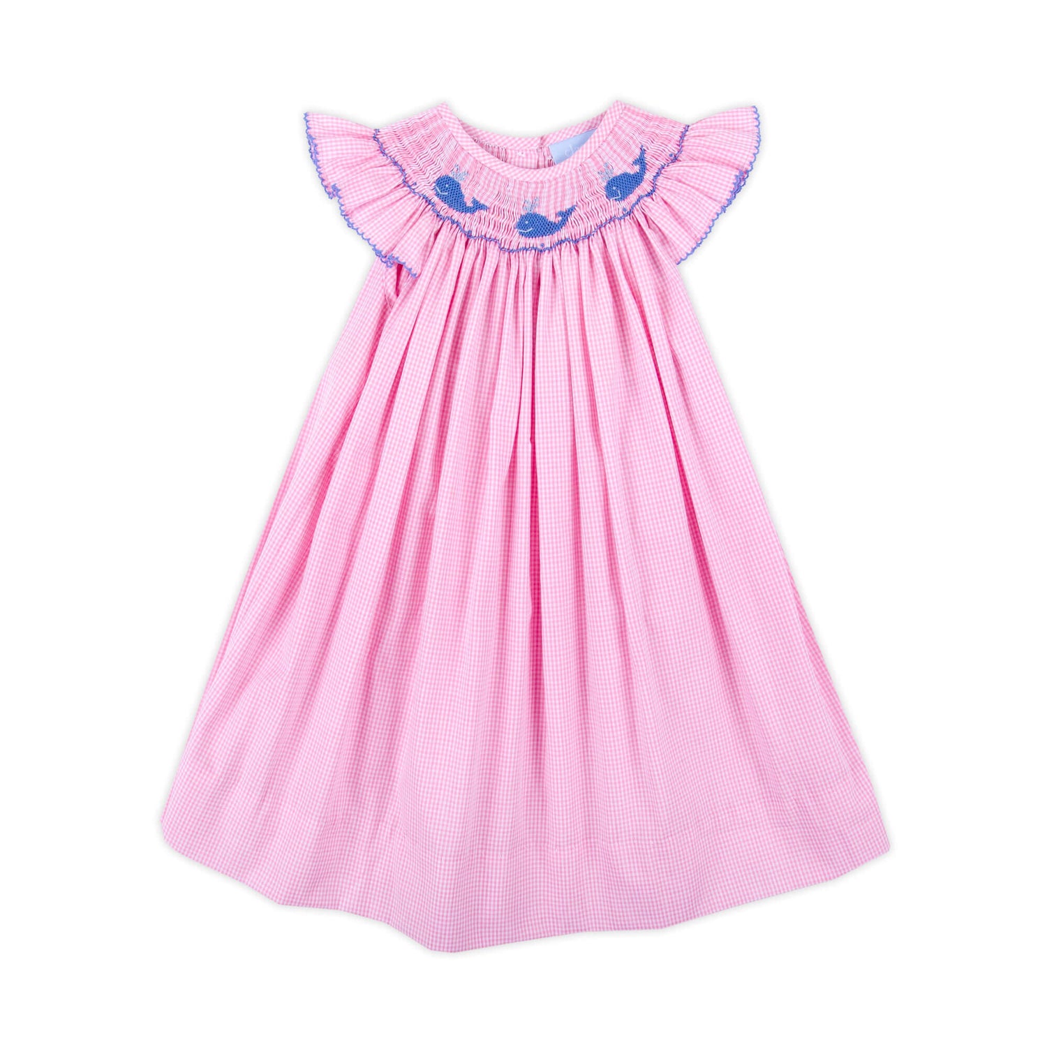 Aquatic Whale Pink Gingham Smocked Angel Sleeve Dress