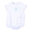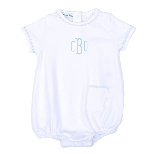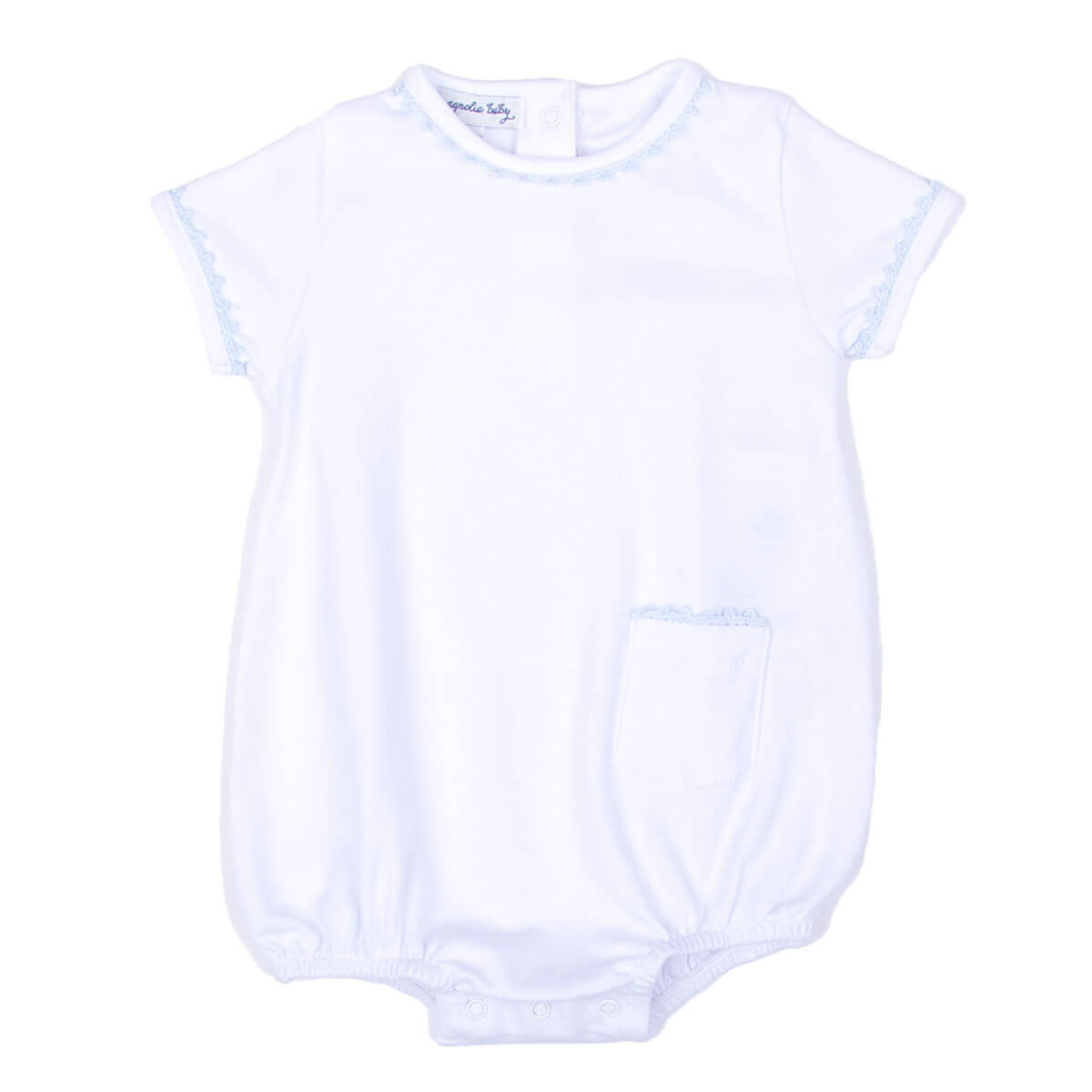For all of baby's first moments, this boy's bubble outfit is the perfect choice! Made from the softest white pima cotton embroidered with delicate blue trim and the sweetest little pocket detail. Short sleeve. Snaps in stride. Made in Peru. Coordinates with other items in the Baby Joy Collection.