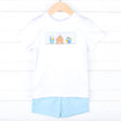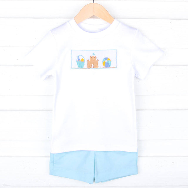 Let's build a sand castle! The Beach Baby Mint Smocked Short Set is the ideal outfit for your upcoming beach vacation. The white shirt features a delightful smocked sandcastle scene, paired with mint waistband shorts to complete the set.