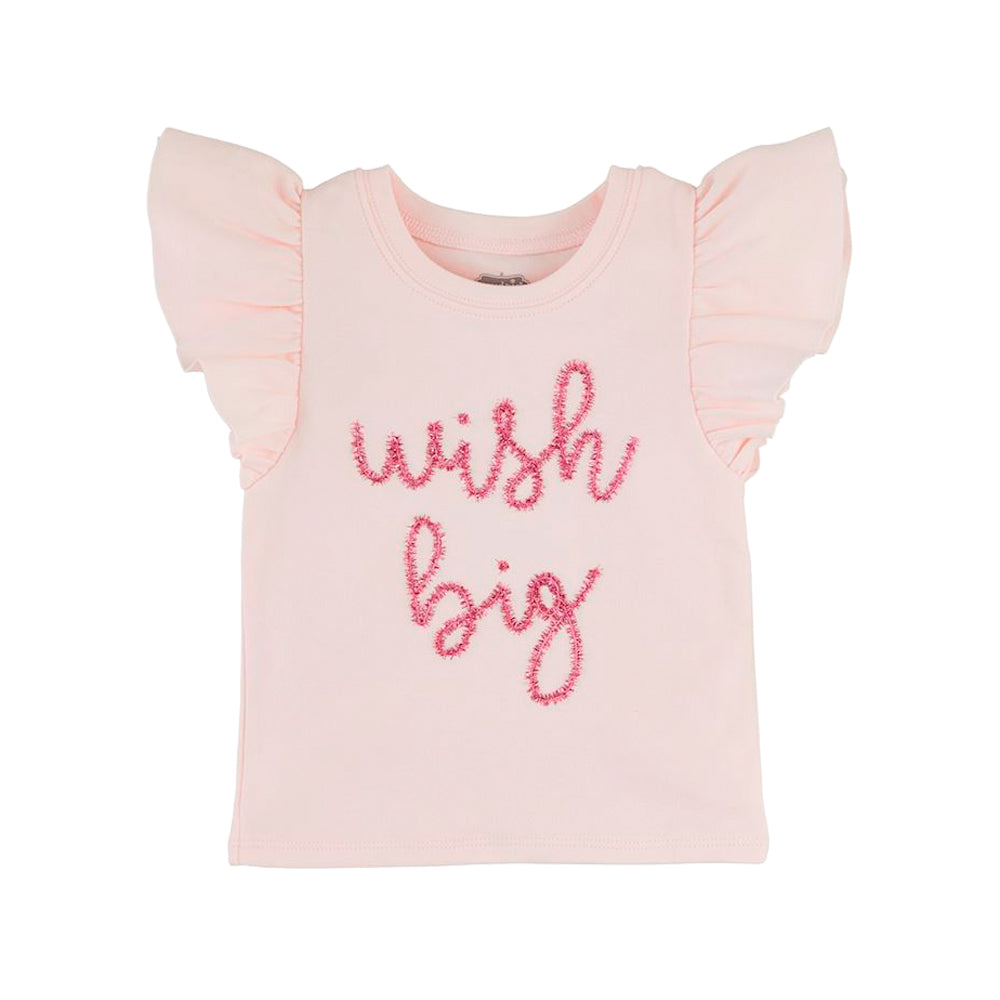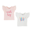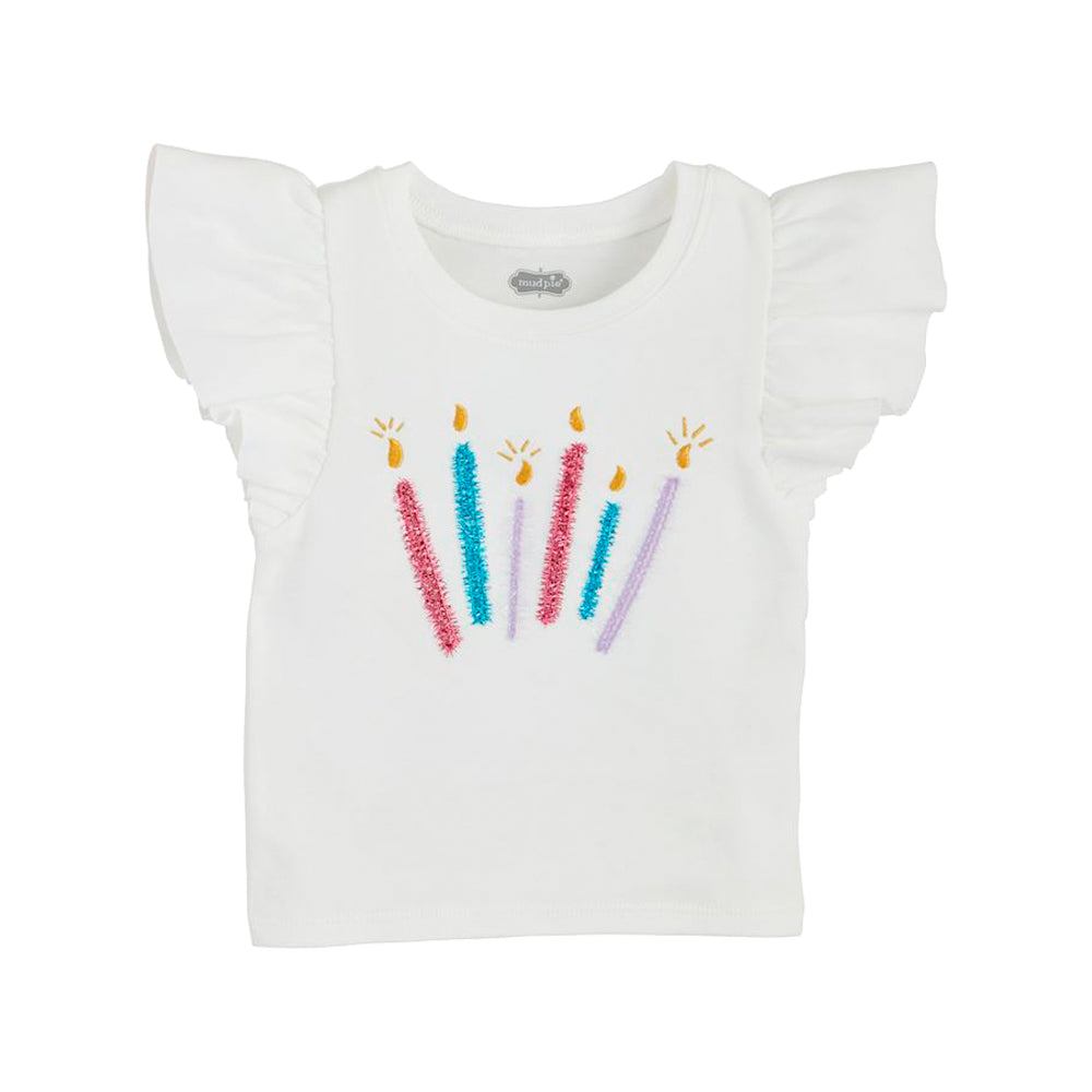 Girls' Birthday Tee. This delightful cotton interlock tee is designed to make any birthday celebration extra special. It features charming flutter sleeves that add a touch of whimsy and elegance. The applied tinsel detail provides a sparkling accent, perfect for capturing the festive spirit. This tee is crafted from 100% cotton, ensuring a soft and comfortable fit for your little one. Ideal for pairing with skirts, shorts, or jeans, this versatile tee is a must-have for any birthday wardrobe.