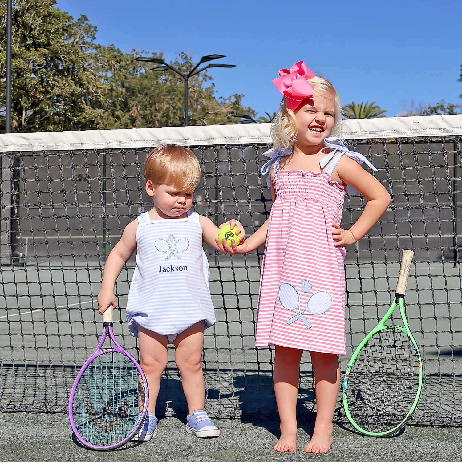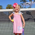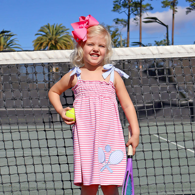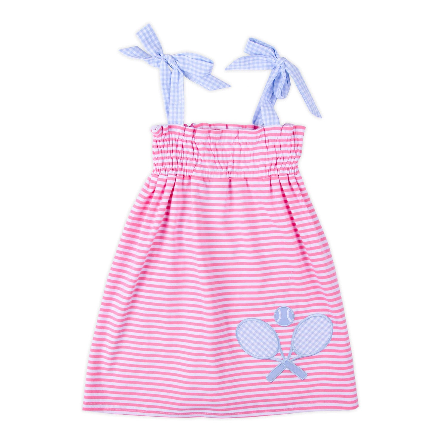 Get your little one ready for tennis fun with the Blue Tennis Racquet Pink Stripe Aurora Dress. The Aurora-style dress features a pink stripe print with stretchable smocking, tie straps, and a charming tennis racquet applique.