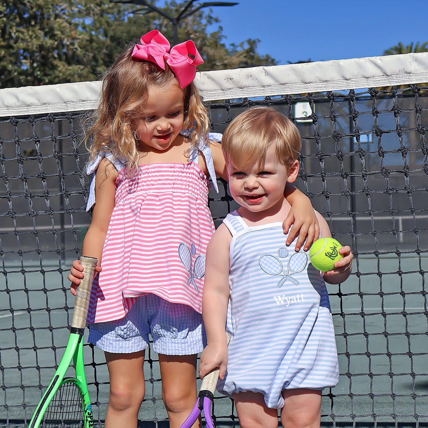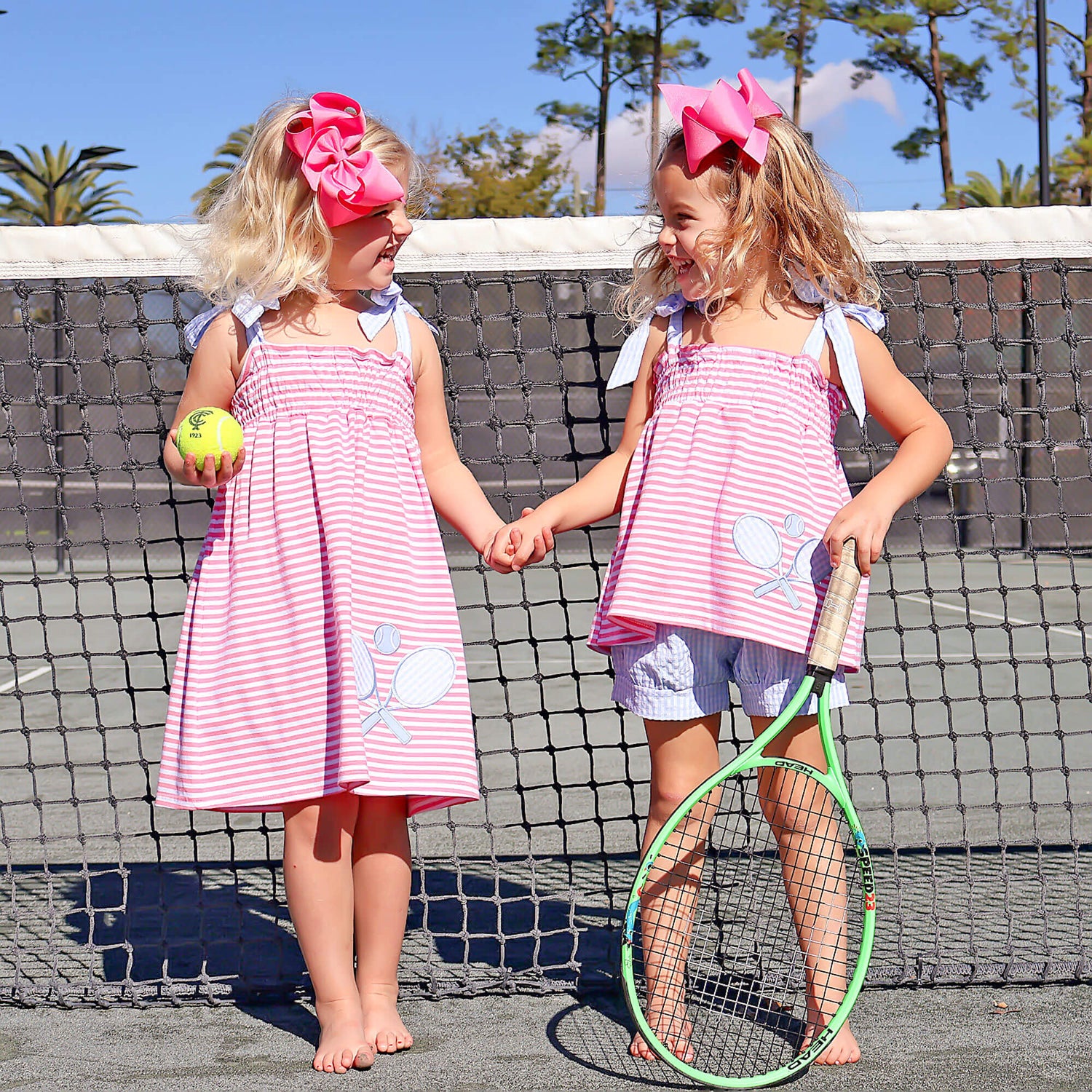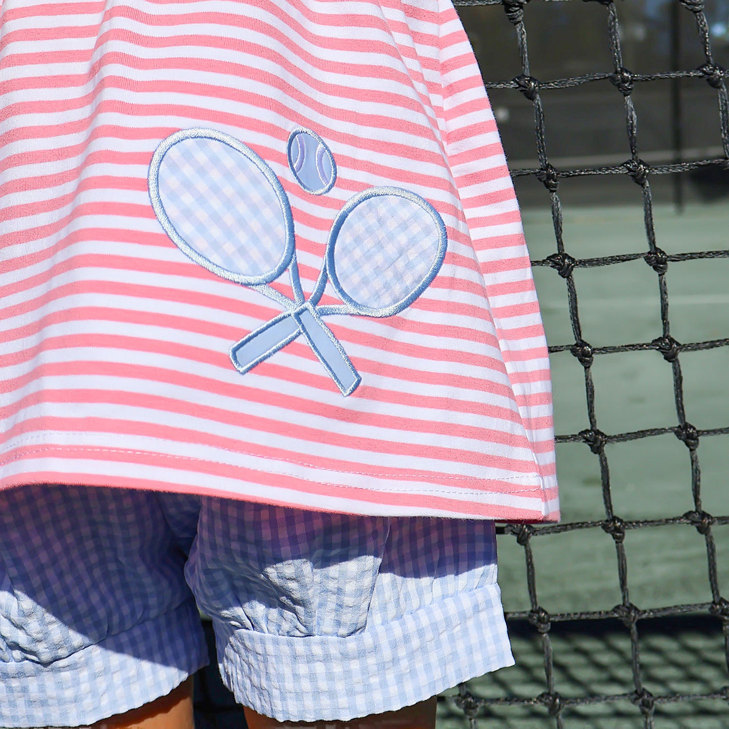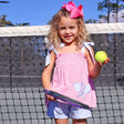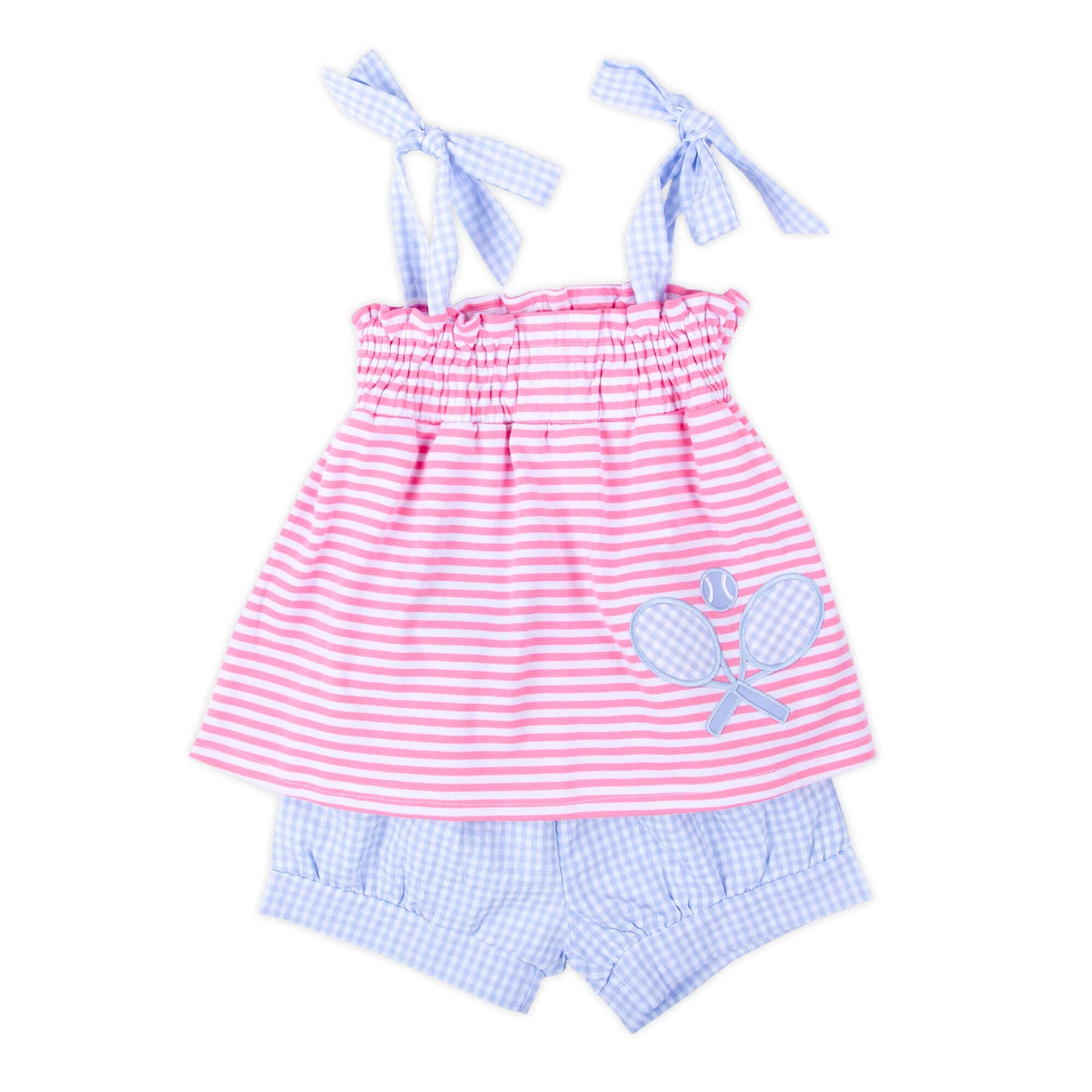 Get your little one ready for tennis fun with the Blue Tennis Racquet Pink Stripe Aurora Short Set. The Aurora-style short set features a pink stripe print with stretchable smocking, tie straps, and a charming tennis racquet applique. The set is completed with blue gingham shorts for a delightful and coordinated outfit.