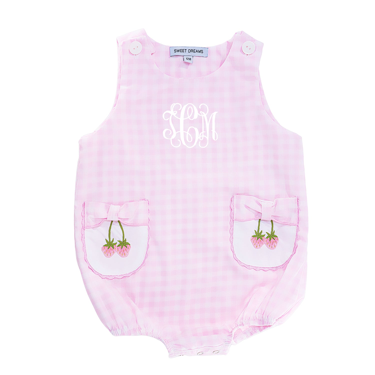 This Bow Pocket Embroidered Strawberry Bubble is the sweetest spring outfit. The sleeveless bubble features pink gingham with custom embroidered berries on the cutest bow pockets. With snaps in stride for easy changing. Add a monogram to make it extra special!
