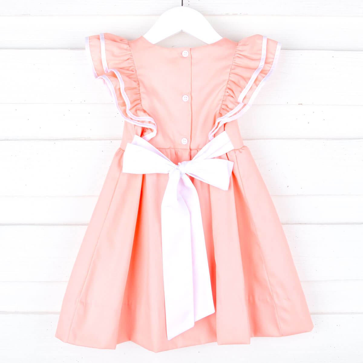 Step into springtime with the timeless elegance of our Peach Pique Alice Dress! This classic outfit features double ruffle sleeves adorned with white tape trim. For a personalized touch, consider adding a monogram to complete the look. This charming outfit coordinates with our Eden Garden collection.