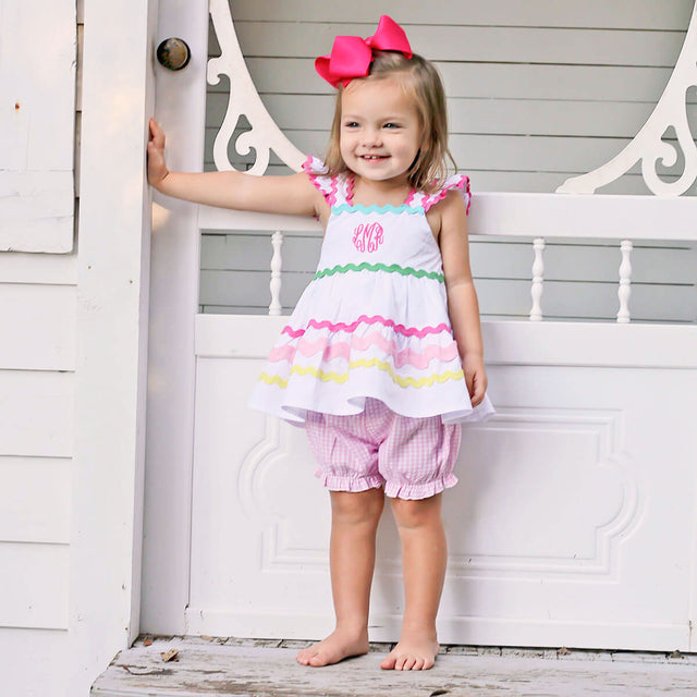 Introducing the vibrant and joyful Rainbow Ric Rac Callie Bloomer Set. This white Callie-style top features delightful colorful ric-rac details. The set is coordinated with pink gingham bloomers. Make it uniquely hers by adding a personalized monogram for an extra special touch.