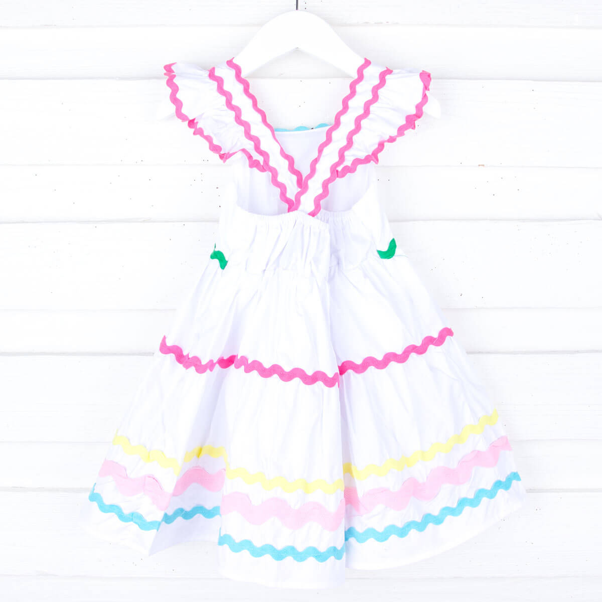 Introducing the vibrant and joyful Rainbow Ric Rac Callie Dress. This white Callie-style dress features delightful colorful ric-rac details and charming cross straps. Make it uniquely hers by adding a personalized monogram for an extra special touch.