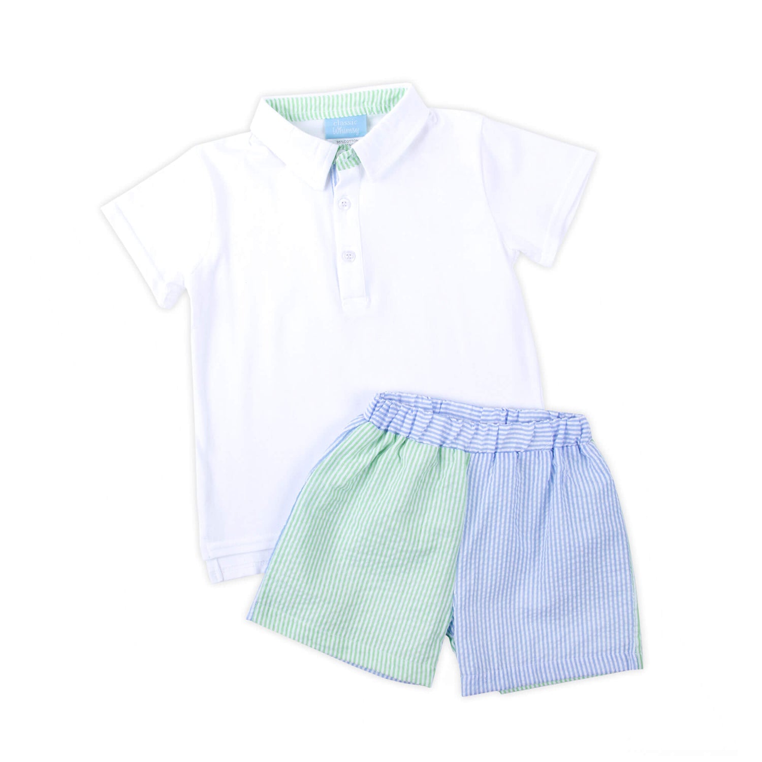 This Colors of Summer Polo Short Set is a stylish and comfortable outfit, perfect for any sunny day. The white knit polo features a delightful touch of green and blue stripes on the inner lining tab, enhancing its classic appeal. The set is completed with matching green and blue striped shorts. Personalize the look with a monogram!