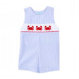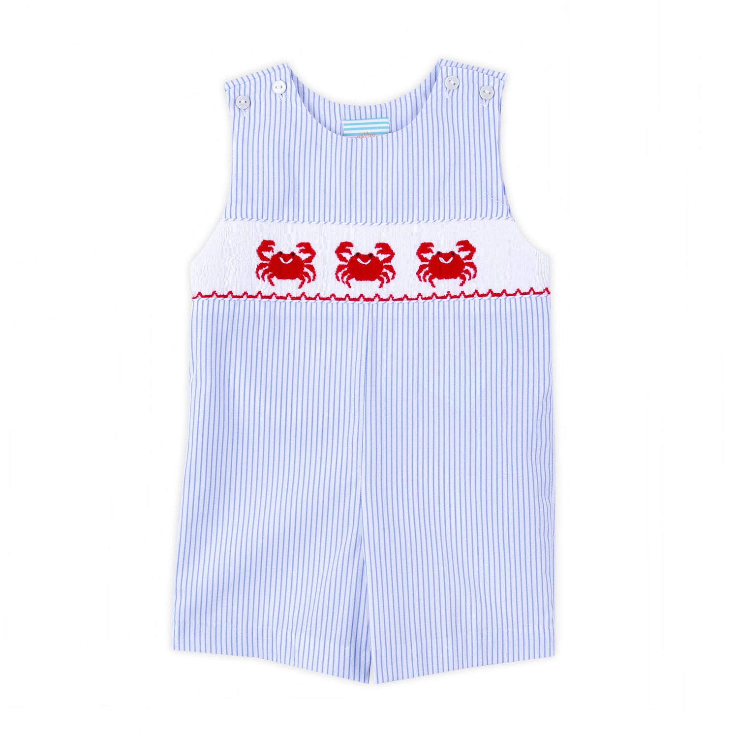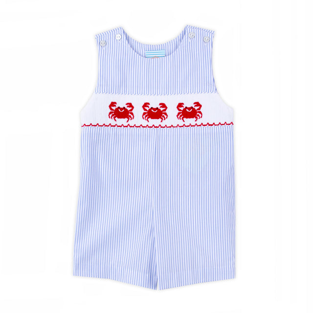 Make a splash in our Crab Treasures Smocked Blue Jon Jon! This blue shirting Jon Jon is full of seaside charm, featuring playful red crab smocking. Shoulder buttons and snaps in stride make for easy changes. Perfect for beach vacations, family getaways, or any summer adventure!