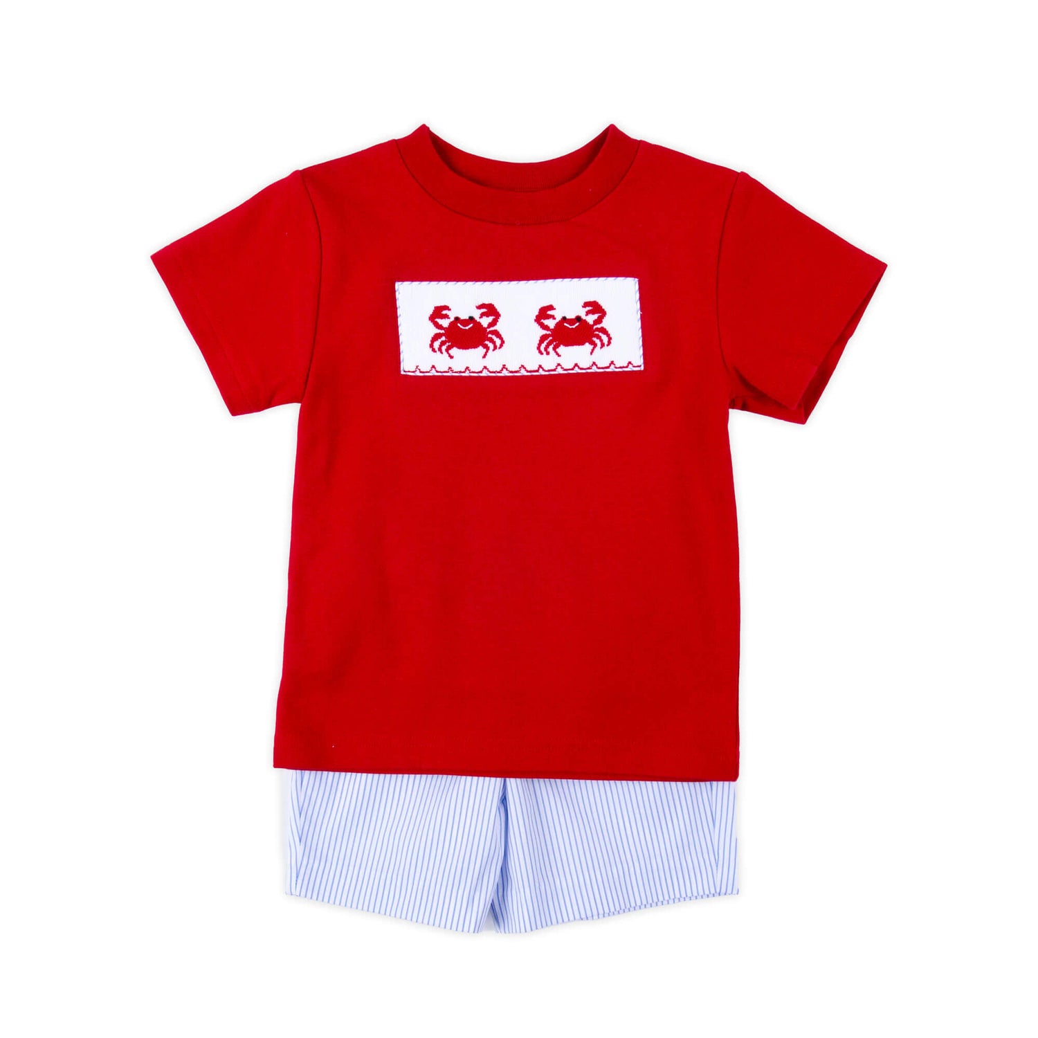 Make a splash in our Crab Treasures Smocked Blue Short Set! This red knit shirt is full of seaside charm, featuring playful red crab smocking. The set includes blue shirting shorts for a perfectly coordinated look. Perfect for beach vacations, family getaways, or any summer adventure!