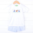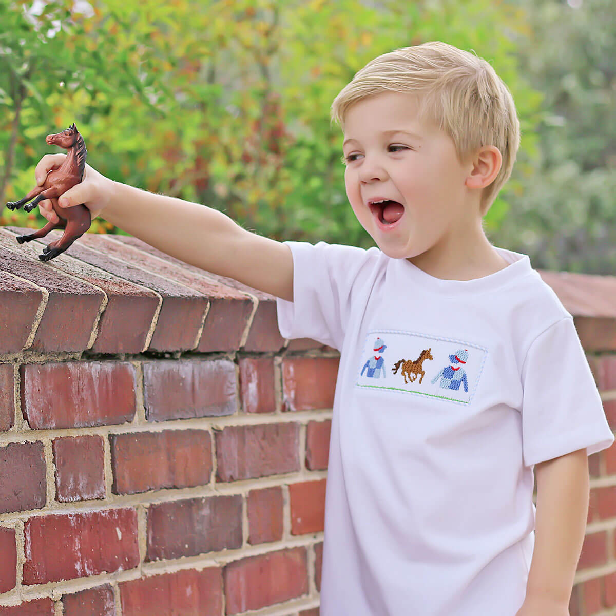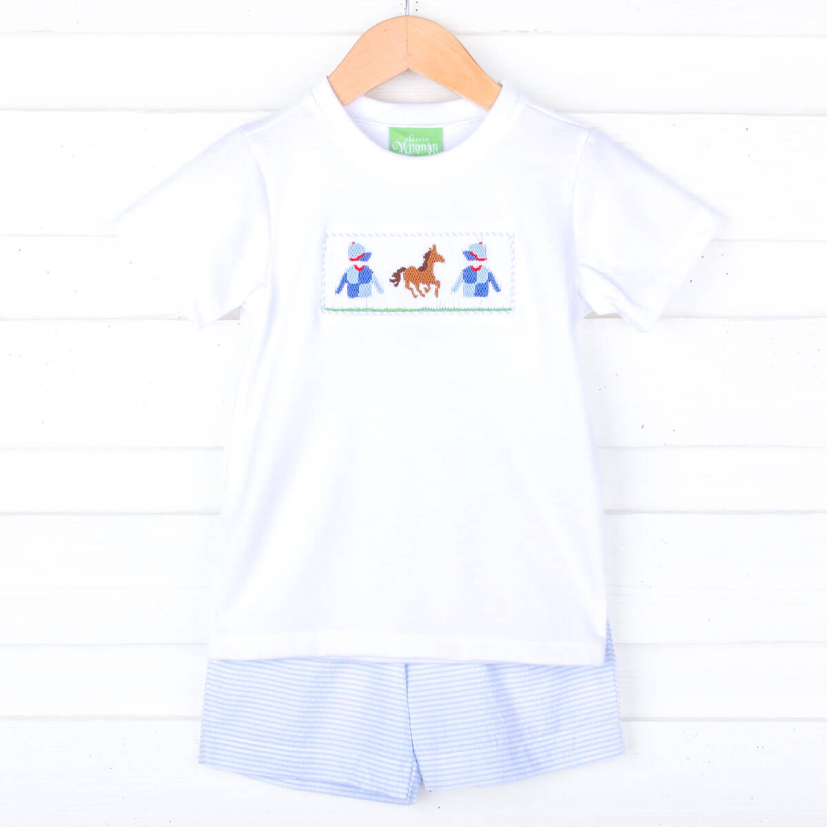 Capture the spirit of the racetrack with our Derby Smocked Blue Stripe Short Set. The white shirt features hand-smocked horses and jockeys, perfectly complemented by the blue stripe waistband shorts for an adorable outfit.